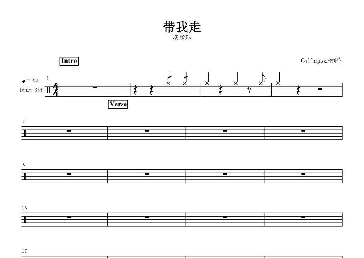 《带我走》是杨丞琳演唱的一首歌曲,这份鼓谱共有三张高清图谱,图谱由 @打鼓谱 编配上传,图谱使用五线谱编配,使用这份带我走架子鼓谱,你将能够轻松地敲打出这首杨丞琳的带我走,快来尝试吧。《带我走》是由吴青峰作词作曲,杨丞琳演唱的一首歌曲,收录在杨丞琳2008年发行的专辑《半熟宣言》中,同时这首歌也是电视剧《不良笑花》的片尾曲。