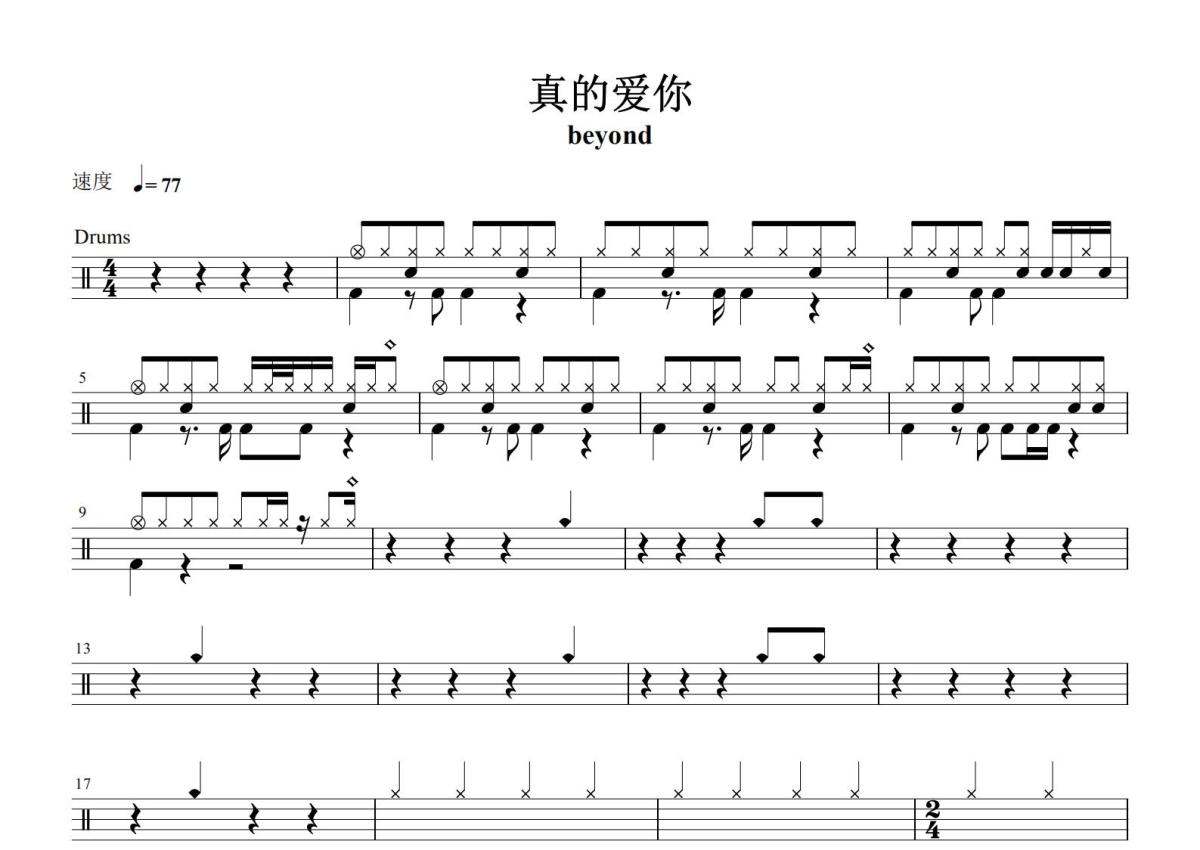 《真的爱你》是Beyond演唱的一首歌曲,这份鼓谱共有三张高清图谱,图谱由 @打鼓谱 编配上传,图谱使用五线谱编配,使用这份真的爱你架子鼓谱,你将能够轻松地敲打出这首Beyond的真的爱你,快来尝试吧。《真的爱你》是中国香港摇滚乐队Beyond演唱的一首粤语歌曲,由梁美薇作词,黄家驹作曲,Beyond编曲,林邝培、Beyond监制,收录于Beyond1989年7月由新艺宝唱片发行的粤语专辑《Beyond IV》 中。该歌曲歌颂了母爱的伟大,其歌词包含了对母爱的感恩和对母亲的祝福。