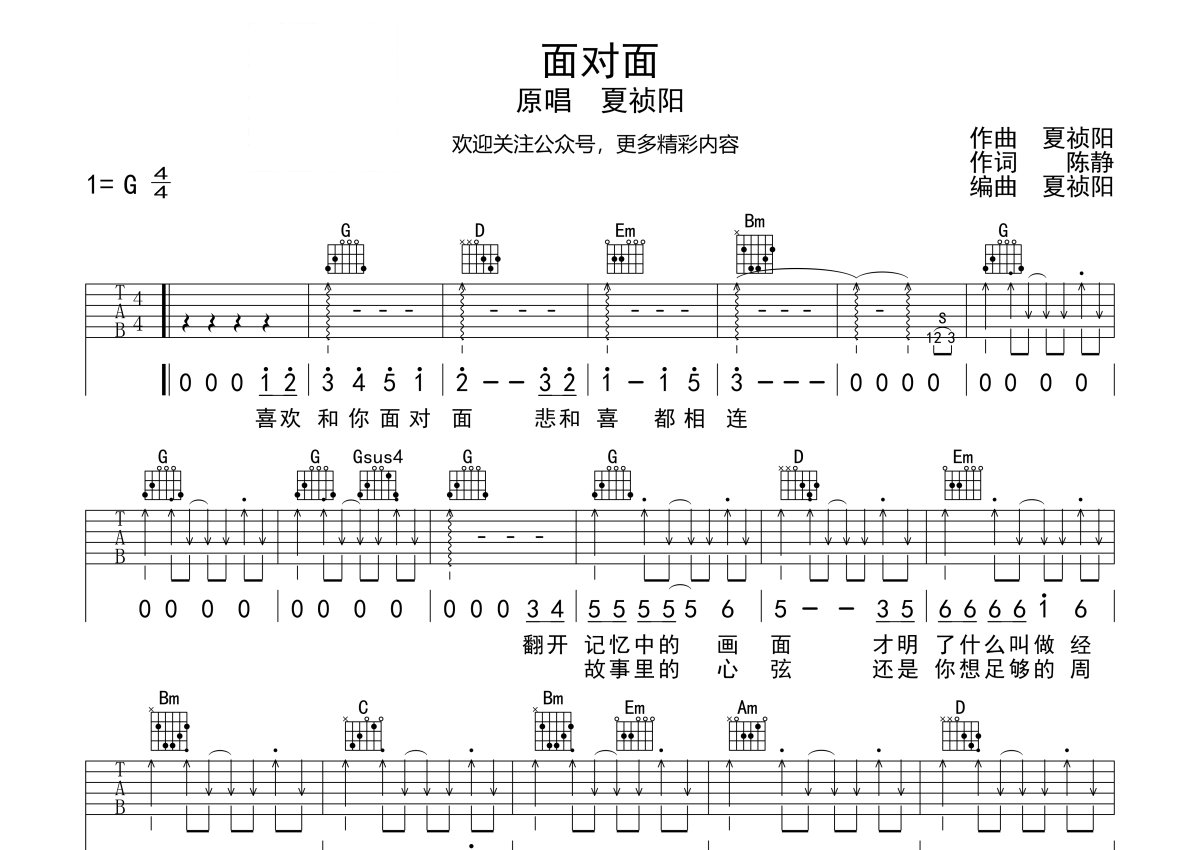 夏祯阳《面对面》吉他谱 - G调弹唱六线谱