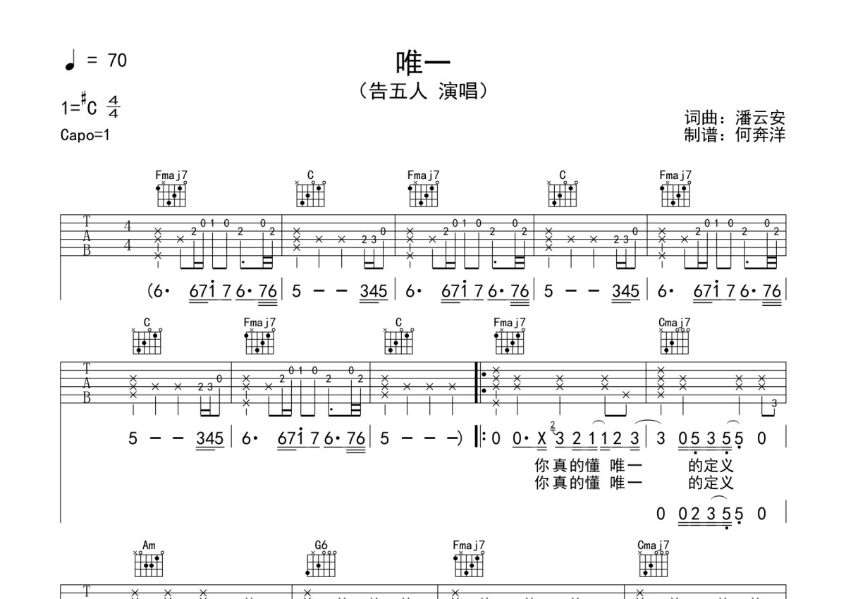 告五人《唯一》吉他谱 - C调弹唱六线谱