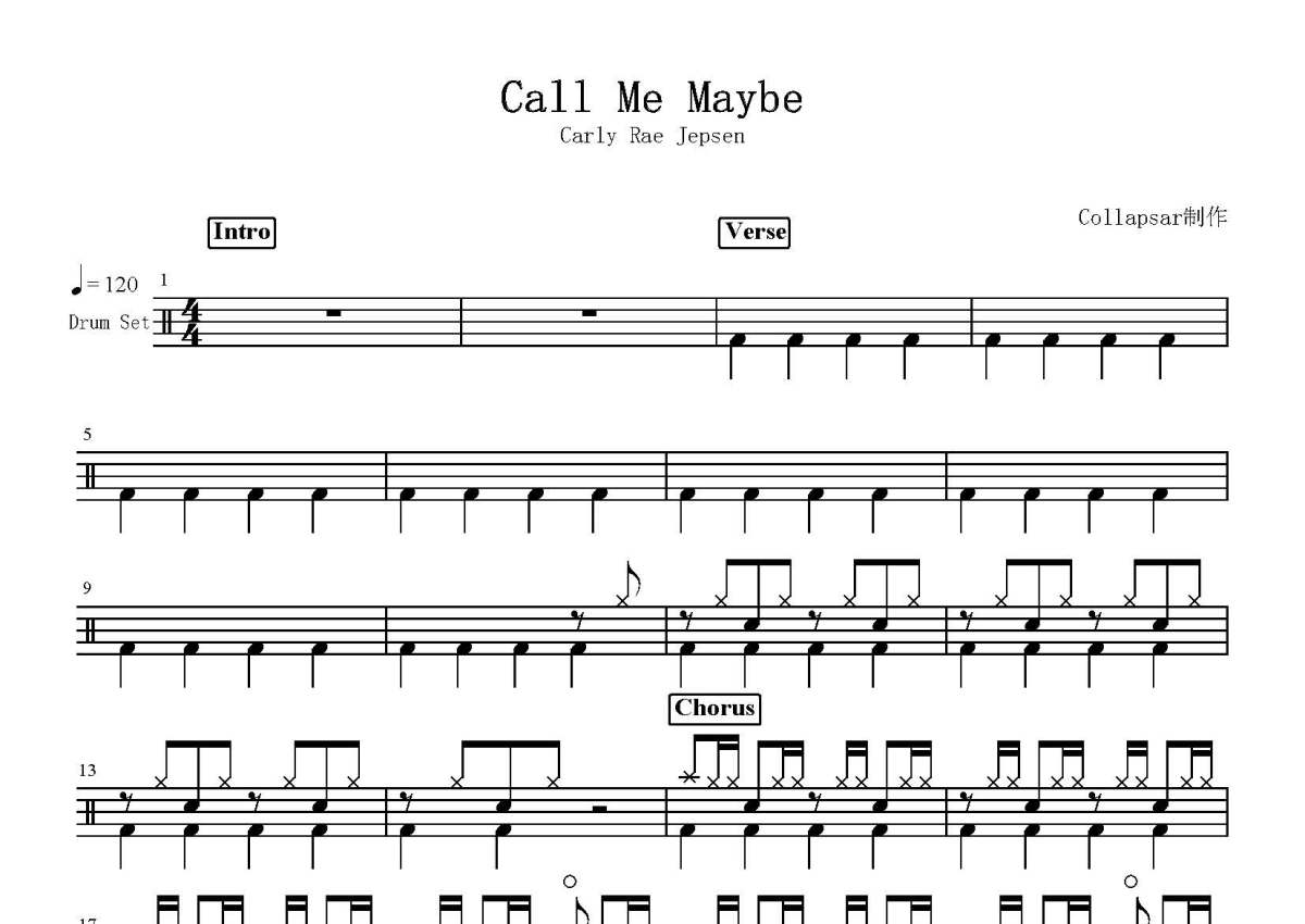《Call Me Maybe》是Carly Rae Jepsen演唱的一首歌曲,这份鼓谱共有三张高清图谱,图谱由 @打鼓谱 编配上传,图谱使用五线谱编配,使用这份Call Me Maybe架子鼓谱,你将能够轻松地敲打出这首Carly Rae Jepsen的Call Me Maybe,快来尝试吧。《Call Me Maybe》是由加拿大女歌手卡莉·蕾·吉普森演唱的一首流行歌曲,该歌曲的歌词和简谱由卡莉·蕾·吉普森、塔维什·克罗和乔什·拉姆齐三人创作,歌曲的音乐制作由乔什·拉姆齐负责。该曲作为推广其所属专辑的首支单曲,于2011年9月20日通过新视镜唱片公司发行,后被收录在卡莉·蕾·吉普森的第二张录音室专辑《Kiss》。