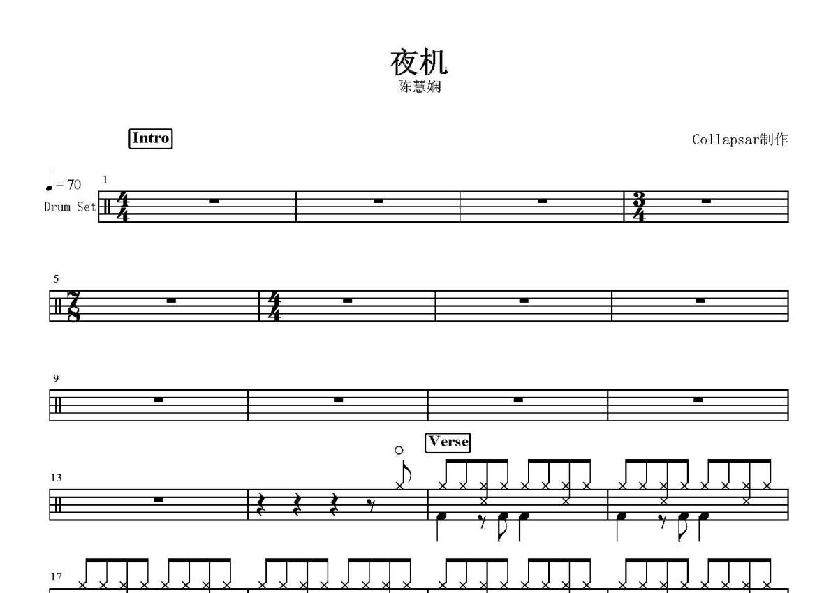 陈慧娴《夜机》鼓谱 - 架子鼓谱