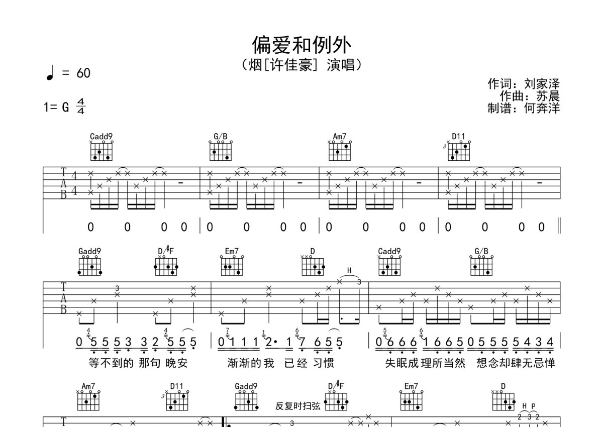 许佳豪《偏爱和例外》吉他谱 - G调弹唱六线谱