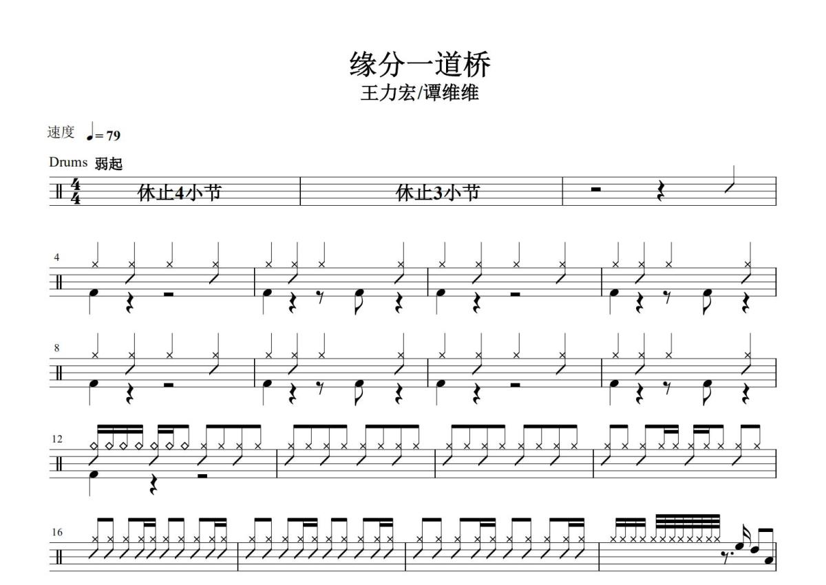 《缘分一道桥》是王力宏、谭维维演唱的一首歌曲,这份鼓谱共有两张高清图谱,图谱由 @打鼓谱 编配上传,图谱使用五线谱编配,使用这份缘分一道桥架子鼓谱,你将能够轻松地敲打出这首王力宏、谭维维的缘分一道桥,快来尝试吧。《缘分一道桥》是王力宏、谭维维合唱的一首歌曲,由方文山作词,王力宏作曲,Tat Tong编曲。该曲是张艺谋执导电影《长城》的片尾曲,于2016年11月15日首发,16日全网上线,后收录在王力宏2017年12月11日发行的专辑《A.I. 爱》中。