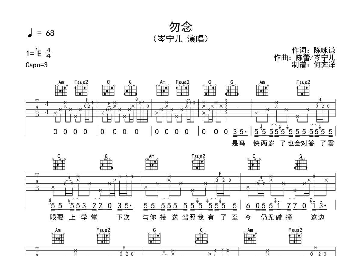 《勿念》是岑宁儿演唱的一首歌曲,本吉他谱采用的是C调指法编配,这份吉他谱共有两张高清图谱,图谱由 @何奔洋 编配上传,图谱使用六线谱编配,包含吉他和弦指法、简谱以及歌词部分,使用这份勿念吉他谱,可以让你更加方便地掌握这首歌曲的弹唱技巧,快来尝试吧。岑宁儿《勿念》吉他谱_C调吉他弹唱谱。