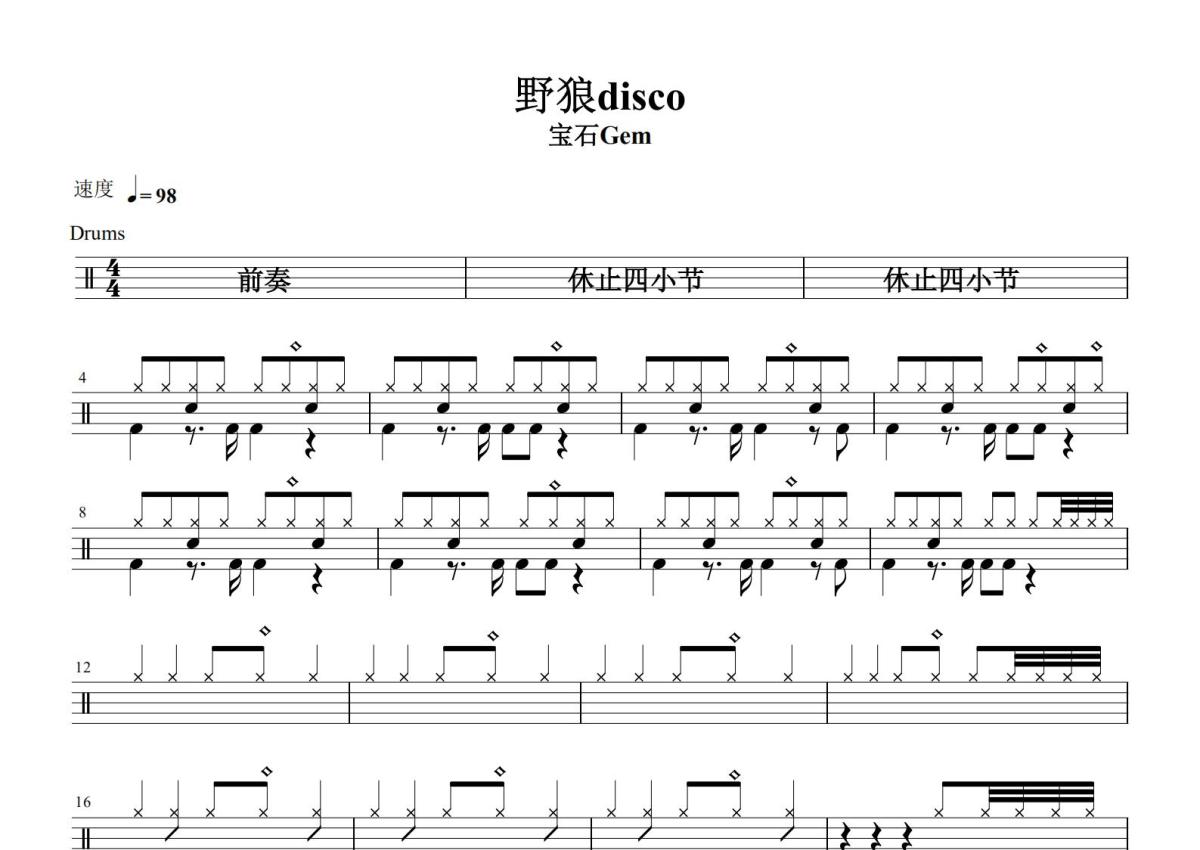 《野狼disco》是宝石Gem演唱的一首歌曲,这份鼓谱共有两张高清图谱,图谱由 @打鼓谱 编配上传,图谱使用五线谱编配,使用这份野狼disco架子鼓谱,你将能够轻松地敲打出这首宝石Gem的野狼disco,快来尝试吧。《野狼disco》是由宝石Gem作词、作曲并演唱的一首歌曲,原版伴奏(Beat)作者为芬兰创作人Vilho Ihaksi。