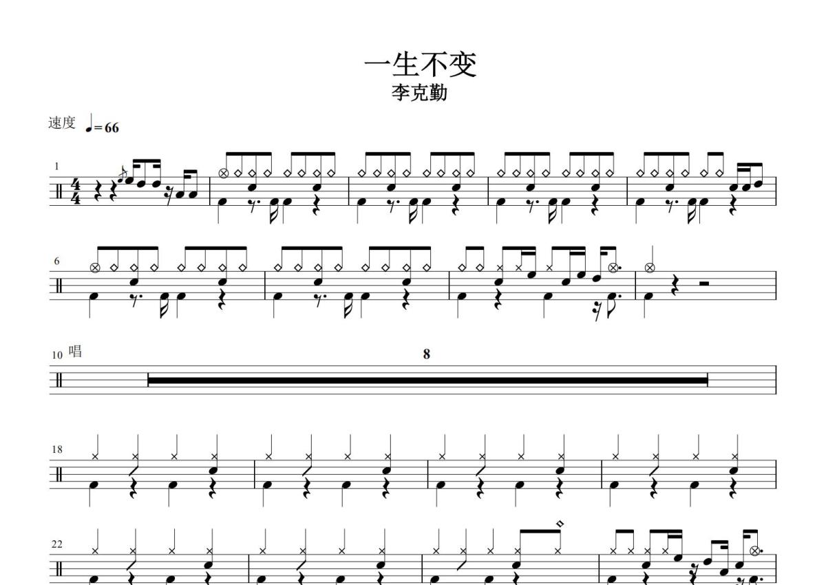 《一生不变》是李克勤演唱的一首歌曲,这份鼓谱共有两张高清图谱,图谱由 @打鼓谱 编配上传,图谱使用五线谱编配,使用这份一生不变架子鼓谱,你将能够轻松地敲打出这首李克勤的一生不变,快来尝试吧。《一生不变》由向雪怀填词,彭永松谱曲,卢东尼编曲 ,由李克勤演唱。该歌曲发行于1989年9月,收录于专辑《Purple Dream》中。