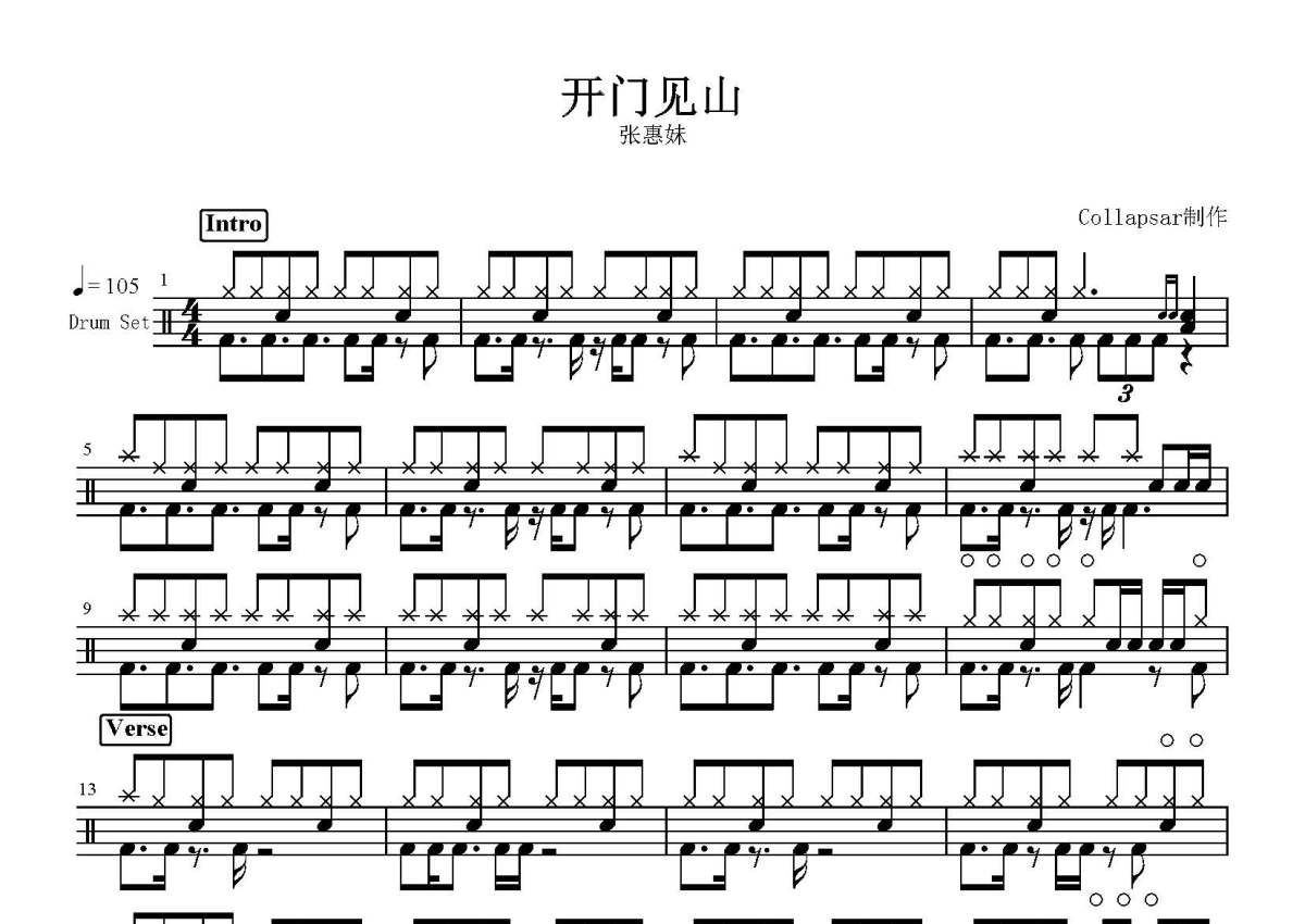 《开门见山》是张惠妹演唱的一首歌曲,这份鼓谱共有三张高清图谱,图谱由 @打鼓谱 编配上传,图谱使用五线谱编配,使用这份开门见山架子鼓谱,你将能够轻松地敲打出这首张惠妹的开门见山,快来尝试吧。《开门见山》是由林夕作词,阿弟仔作曲,张惠妹演唱的一首歌曲,该曲收录于张惠妹2009年发行的专辑《阿密特》。 。