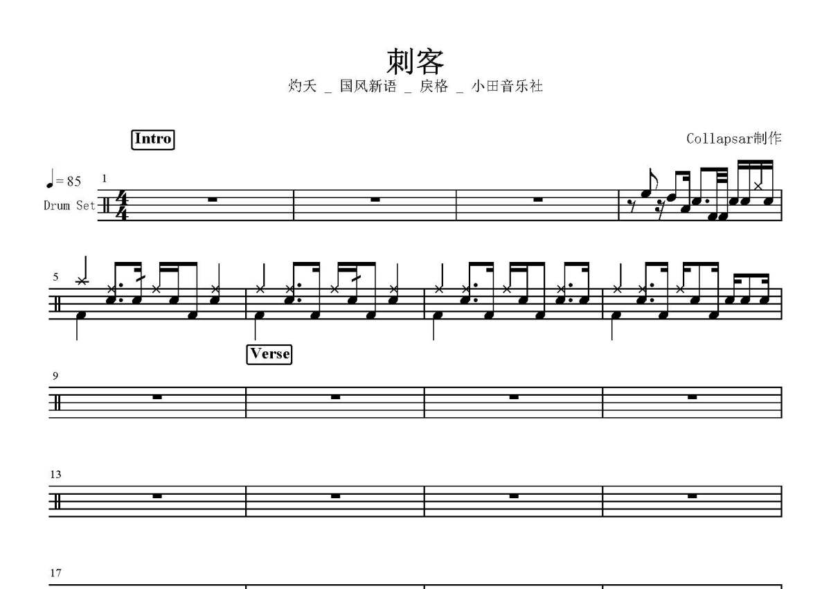 灼夭/国风新语/戾格/小田音乐社《刺客》鼓谱 - 架子鼓谱