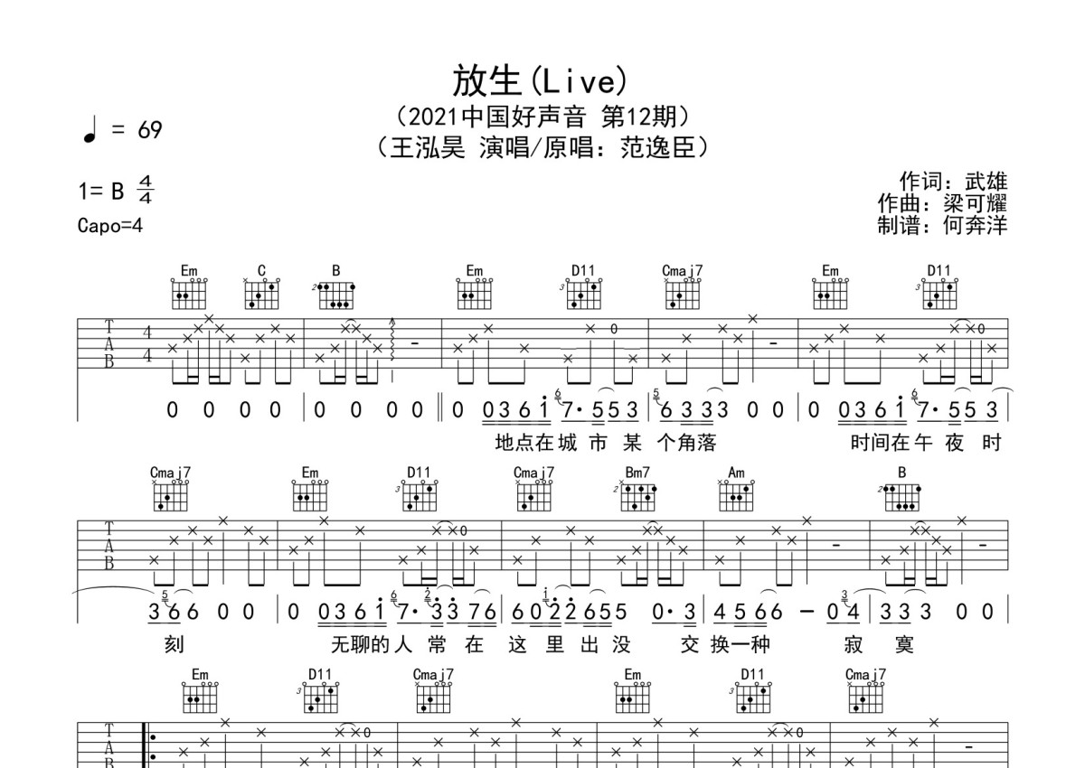 王泓昊《放生》吉他谱 - G调弹唱六线谱 - 中国好声音现场版