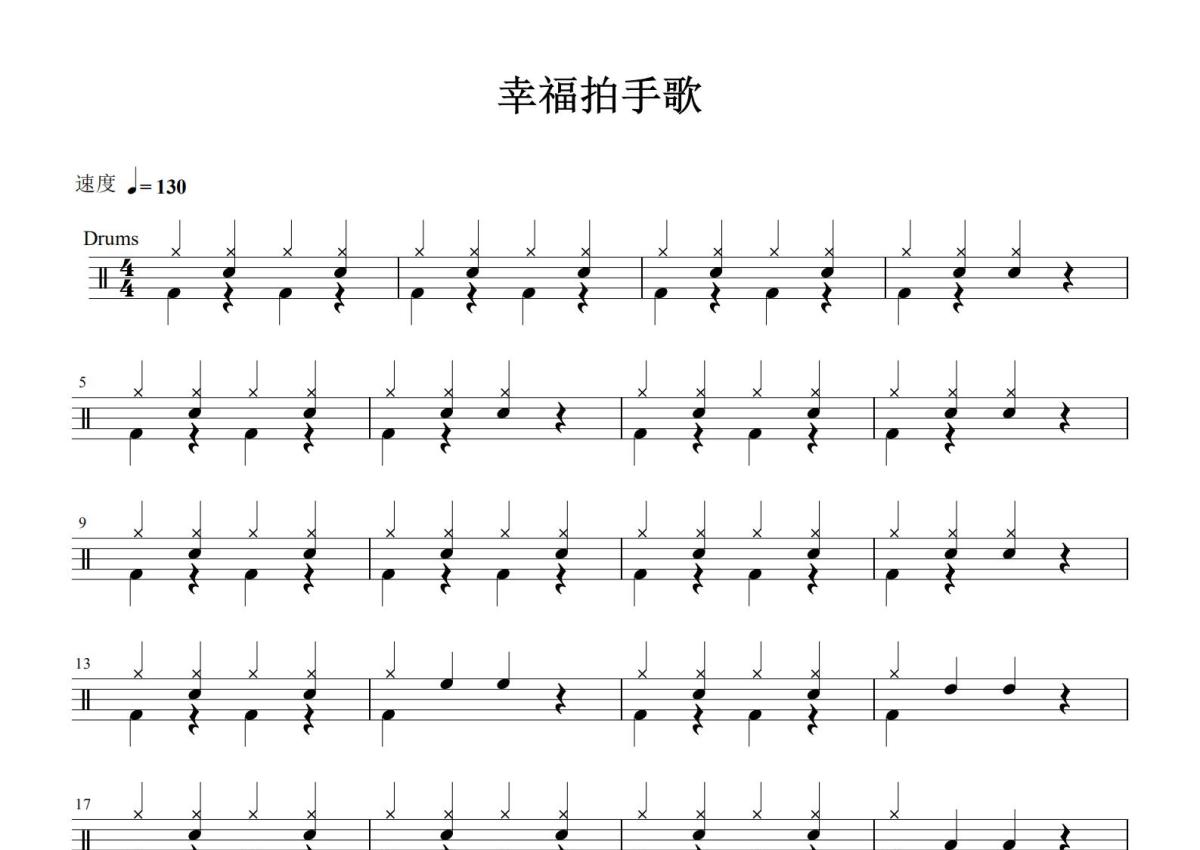 《幸福拍手歌》是儿歌演唱的一首歌曲,这份鼓谱共有一张高清图谱,图谱由 @打鼓谱 编配上传,图谱使用五线谱编配,使用这份幸福拍手歌架子鼓谱,你将能够轻松地敲打出这首儿歌的幸福拍手歌,快来尝试吧。