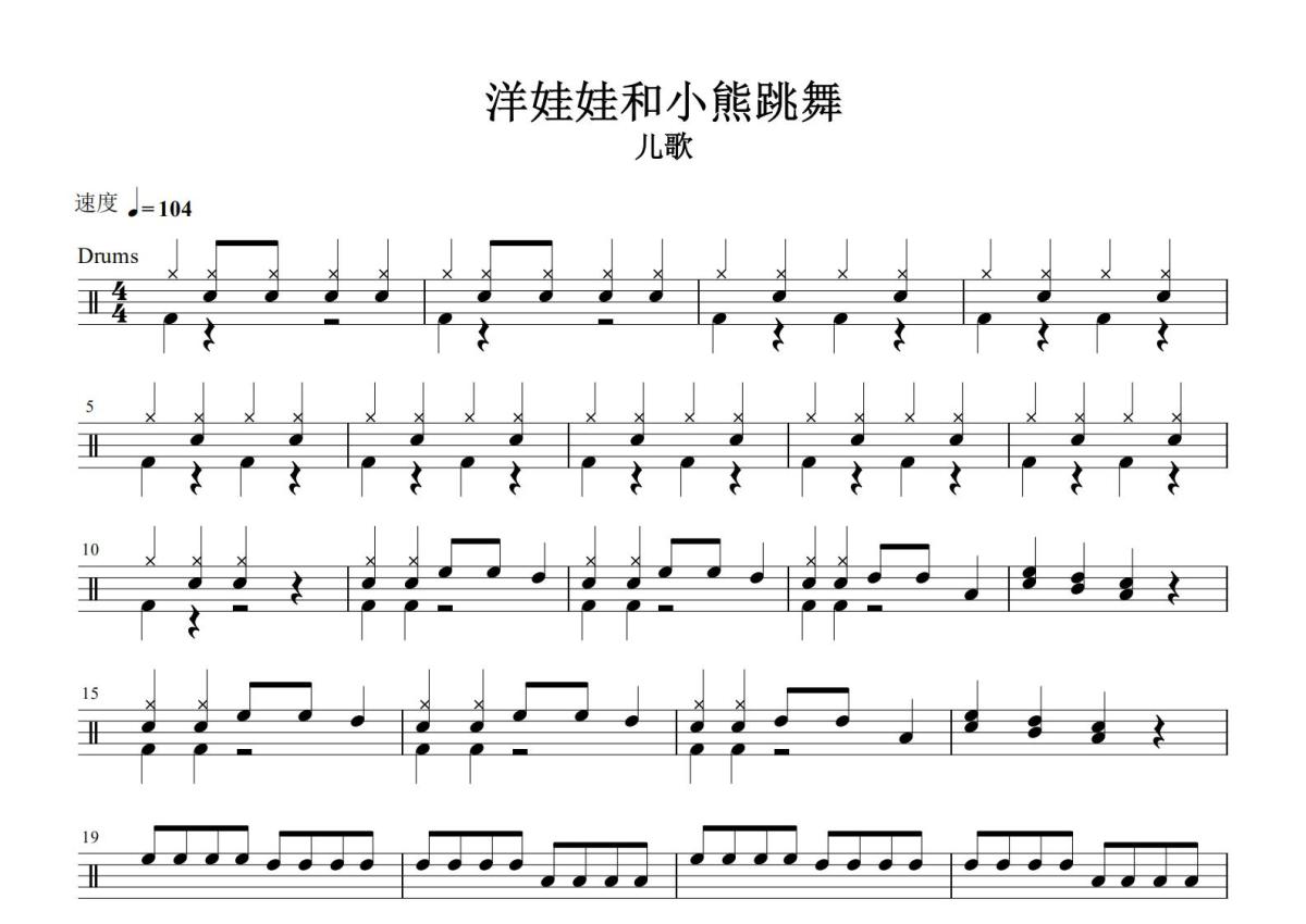 《洋娃娃和小熊跳舞》是儿歌演唱的一首歌曲,这份鼓谱共有一张高清图谱,图谱由 @打鼓谱 编配上传,图谱使用五线谱编配,使用这份洋娃娃和小熊跳舞架子鼓谱,你将能够轻松地敲打出这首儿歌的洋娃娃和小熊跳舞,快来尝试吧。