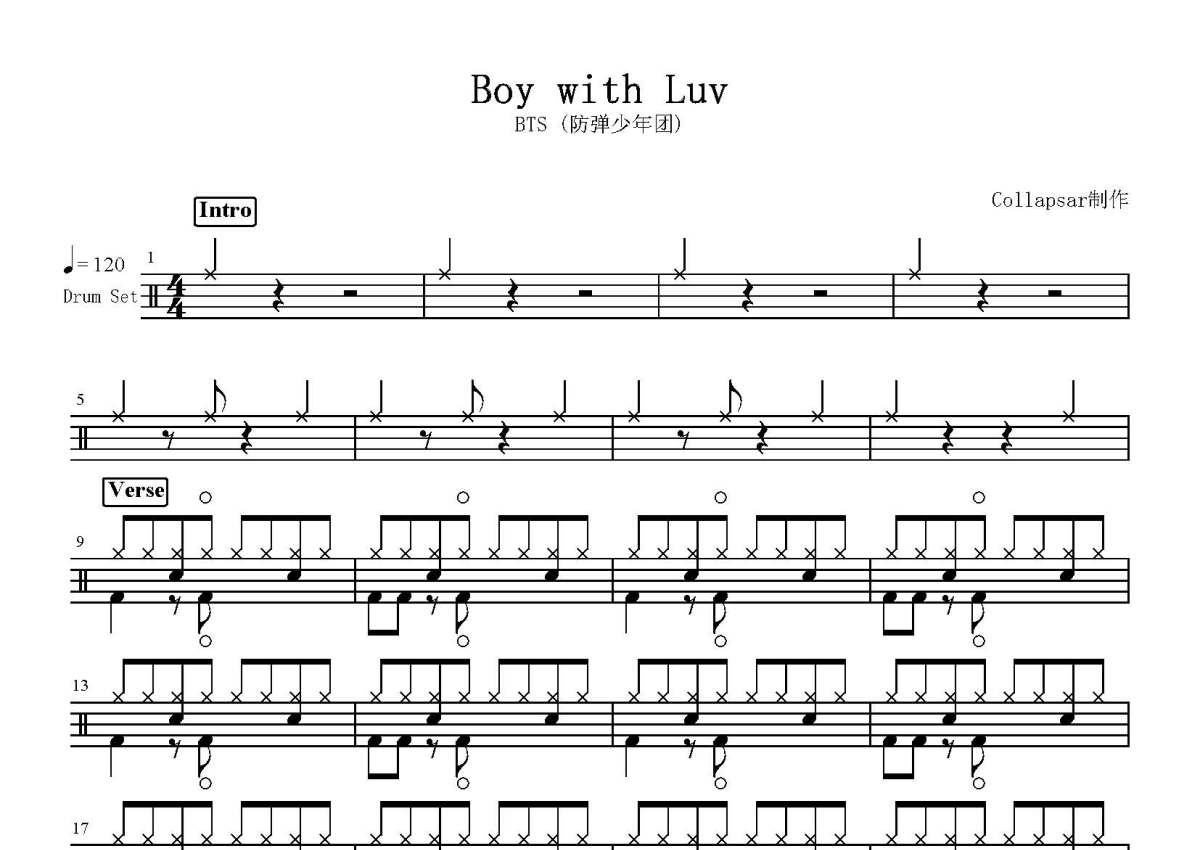 《Boy with Luv》是防弹少年团演唱的一首歌曲,这份鼓谱共有三张高清图谱,图谱由 @打鼓谱 编配上传,图谱使用五线谱编配,使用这份Boy with Luv架子鼓谱,你将能够轻松地敲打出这首防弹少年团的Boy with Luv,快来尝试吧。《Boy with Luv》是韩国组合防弹少年团与美国流行女歌手海尔希合作录唱的一首歌曲,被收录在防弹少年团于2019年4月12日发行的第六张迷你专辑《Map of the Soul:Persona》。