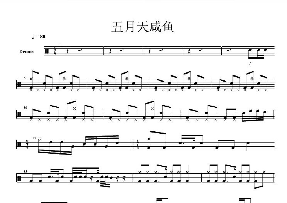 《咸鱼》是五月天演唱的一首歌曲,这份鼓谱共有三张高清图谱,图谱由 @打鼓谱 编配上传,图谱使用五线谱编配,使用这份咸鱼架子鼓谱,你将能够轻松地敲打出这首五月天的咸鱼,快来尝试吧。《咸鱼》是五月天演唱的一首歌曲,此曲由阿信填词,谱曲,改编自五月天的闽南语歌曲《憨人》,收录于五月天2005年发行的专辑《知足》中。 五月天(Mayday),中国台湾摇滚乐团,成立于1997年3月29日,由温尚翊(怪兽)、陈信宏(阿信)、石锦航(石头)、蔡升晏(玛莎)、刘谚明(冠佑)五名成员组成。