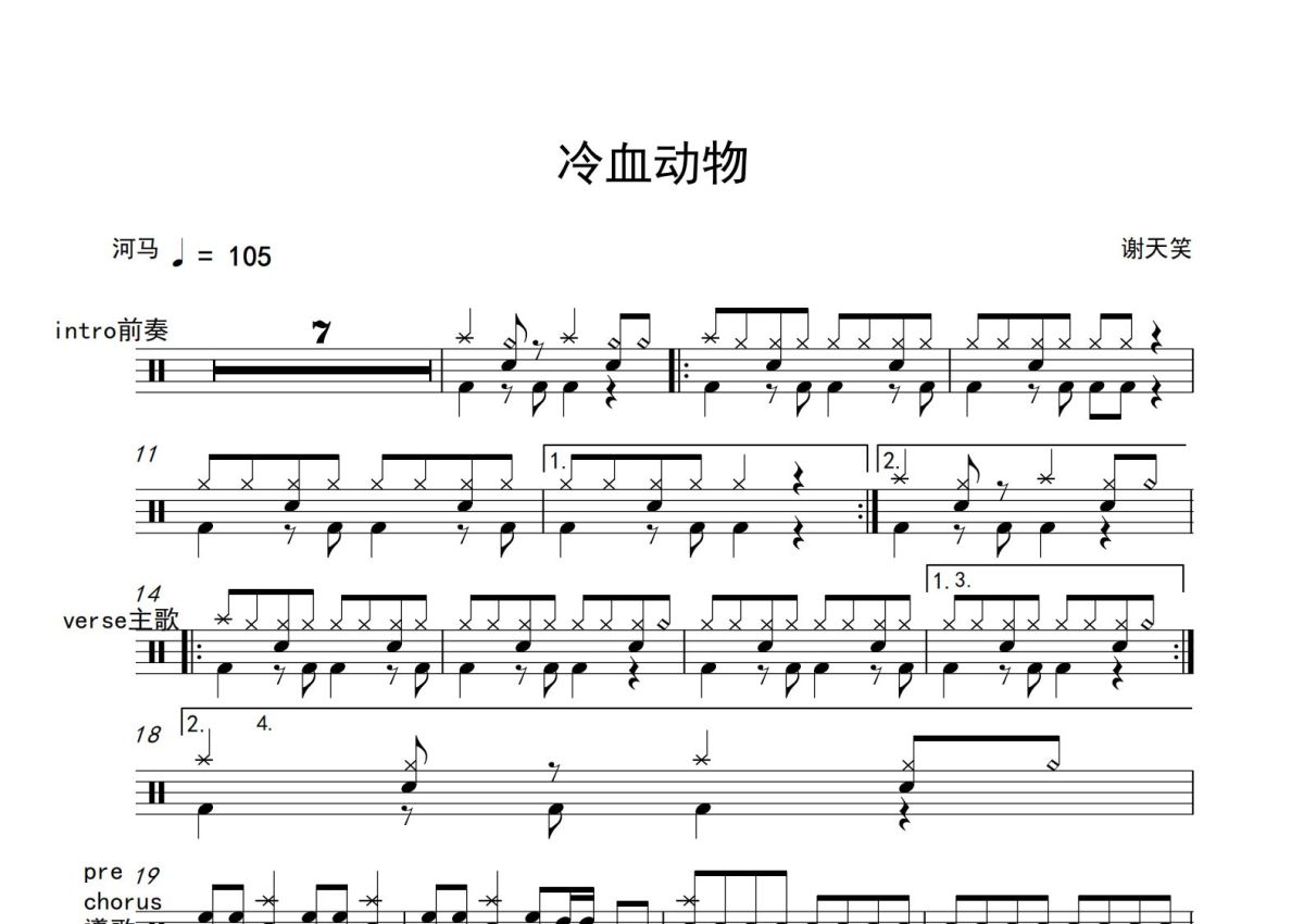 《冷血动物》是谢天笑演唱的一首歌曲,这份鼓谱共有两张高清图谱,图谱由 @打鼓谱 编配上传,图谱使用五线谱编配,使用这份冷血动物架子鼓谱,你将能够轻松地敲打出这首谢天笑的冷血动物,快来尝试吧。《冷血动物》是 谢天笑演唱的歌曲,收录于2005年3月1日发行的《谢天笑与冷血动物》专辑中。
