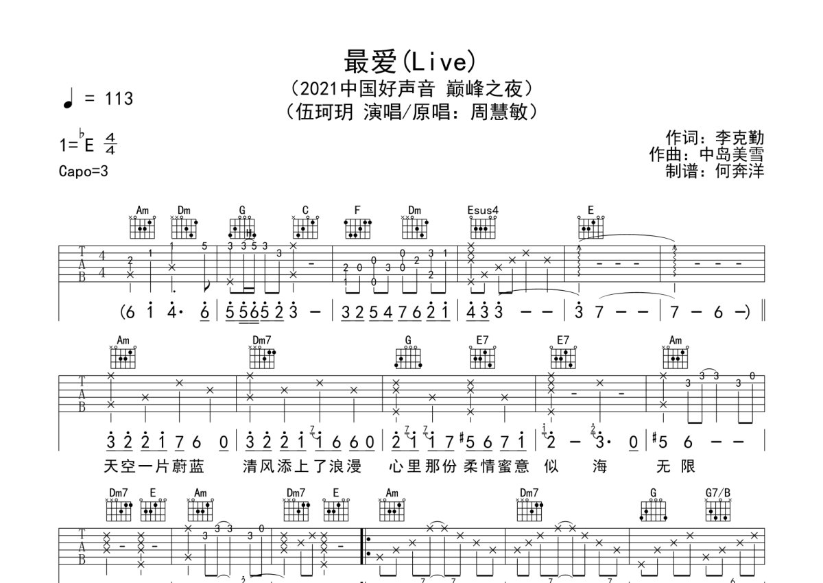 伍珂玥《最爱》吉他谱 - C调弹唱六线谱 - 中国好声音现场版