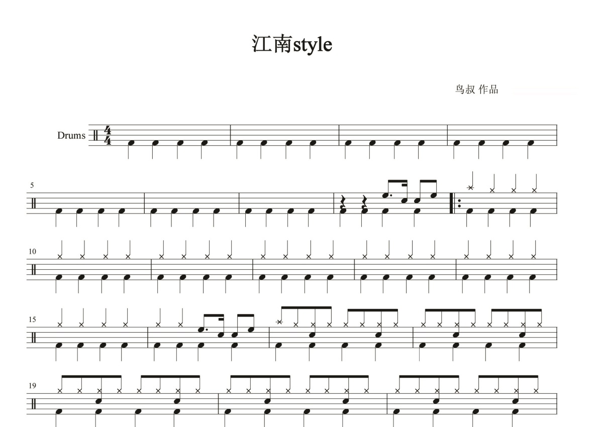 《江南style》是鸟叔演唱的一首歌曲,这份鼓谱共有两张高清图谱,图谱由 @打鼓谱 编配上传,图谱使用五线谱编配,使用这份江南style架子鼓谱,你将能够轻松地敲打出这首鸟叔的江南style,快来尝试吧。《江南style》(韩语:강남 스타일)是韩国音乐人PSY的一首K-Pop单曲。这首歌曲作为PSY第六张录音室专辑《PSY 6甲 PART1》的主打歌于2012年7月发布,首次进入韩国国家公认音乐排行榜“Gaon Chart”就登上榜首。2012年12月21日UTC15:50左右,《江南style》成为互联网历史上第一个点击量超过10亿次的视频。2012年9月,这支音乐录像带还打破吉尼斯世界纪录,成为YouTube历史上最受人“喜欢”的视频。 朴载相(Psy) [1] ,1977年12月31日出生于韩国。