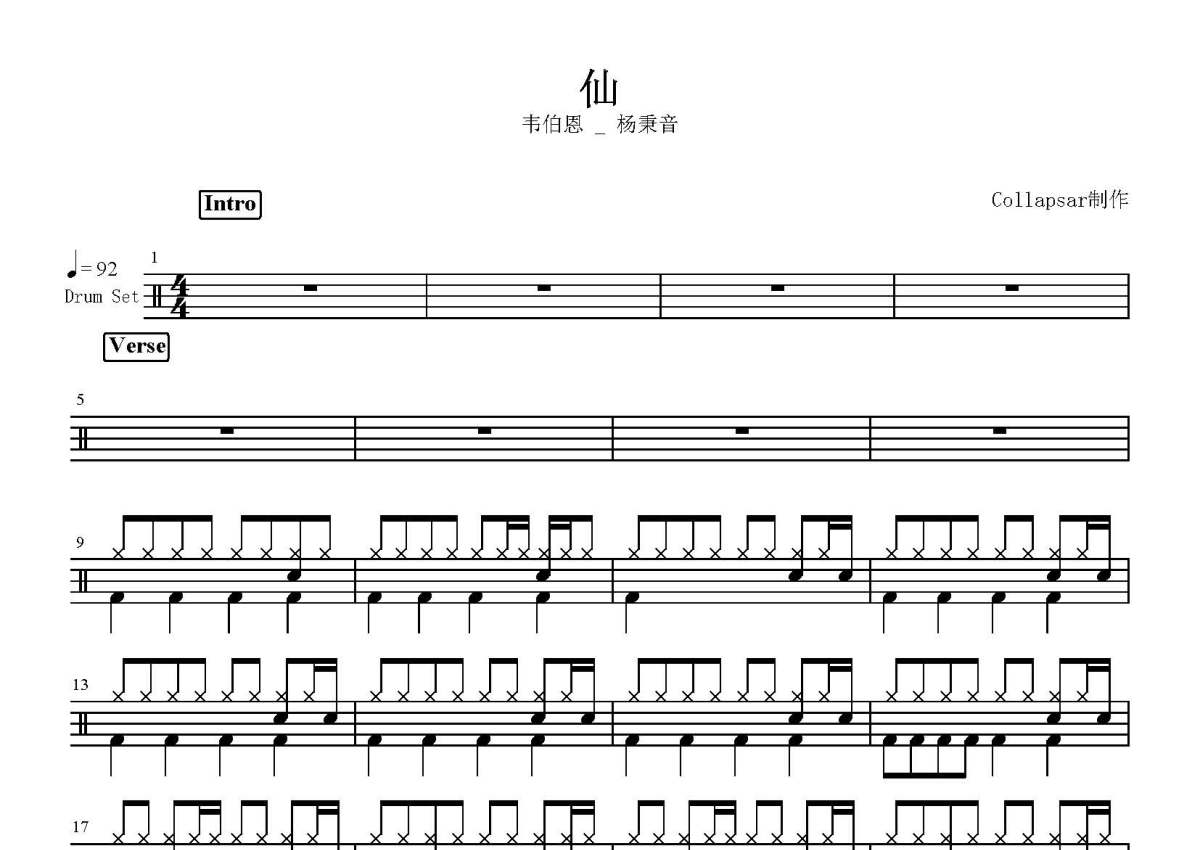 韦伯恩/杨秉音《仙》鼓谱 - 架子鼓谱
