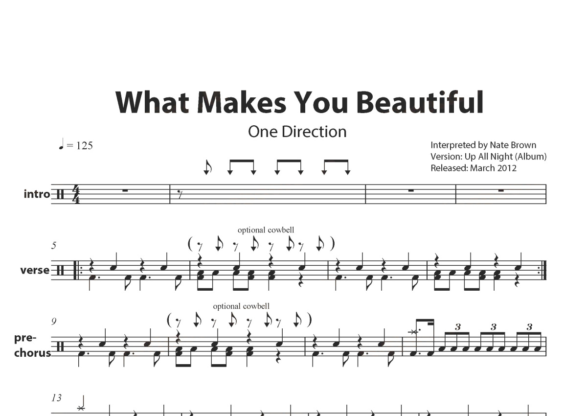 《What Makes You Beautiful》是One Direction演唱的一首歌曲,这份鼓谱共有三张高清图谱,图谱由 @打鼓谱 编配上传,图谱使用五线谱编配,使用这份What Makes You Beautiful架子鼓谱,你将能够轻松地敲打出这首One Direction的What Makes You Beautiful,快来尝试吧。《What Makes You Beautiful》是英国男子组合One Direction演唱的一首歌曲,词曲由Savan Kotecha、Carl Falk和Rami Yacoub共同创作。该曲收录于组合的首张录音室专辑《Up All Night》中,并作为推广专辑的首支单曲于2011年9月11日发行。One Direction(单向组合),英国流行乐男子组合,现以路易斯·汤姆林森、哈里·斯泰尔斯、利亚姆·佩恩、奈尔·霍兰四名成员的组成形式展开活动。