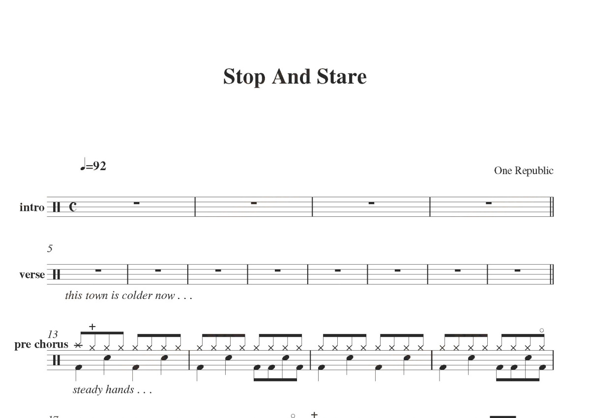 《Stop And Stare》是One Republic演唱的一首歌曲,这份鼓谱共有两张高清图谱,图谱由 @打鼓谱 编配上传,图谱使用五线谱编配,使用这份Stop And Stare架子鼓谱,你将能够轻松地敲打出这首One Republic的Stop And Stare,快来尝试吧。《Stop And Stare》是OneRepublic演唱的一首歌曲,收录在OneRepublic2007年发行的专辑《Dreaming Out Loud》中。OneRepublic(共和时代),美国流行摇滚乐队,2002年组建于美国科罗拉多州科罗拉多斯普林斯,由主唱瑞恩·泰德、吉他手扎克·费尔肯斯、德鲁·布朗、贝斯手布伦特·库泽、鼓手艾迪·费雪组成。