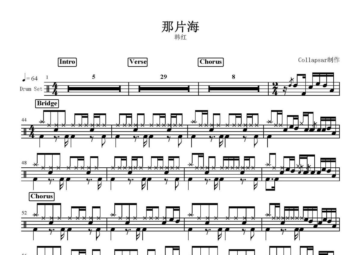 《那片海》是韩红演唱的一首歌曲,这份鼓谱共有一张高清图谱,图谱由 @打鼓谱 编配上传,图谱使用五线谱编配,使用这份那片海架子鼓谱,你将能够轻松地敲打出这首韩红的那片海,快来尝试吧。《那片海》是一首选自韩红专辑《醒了》的国语歌曲,由韩红作词、作曲并演唱,在2001年5月1日由麒麟童唱片出版并发行,同时《那片海》有几个版本。