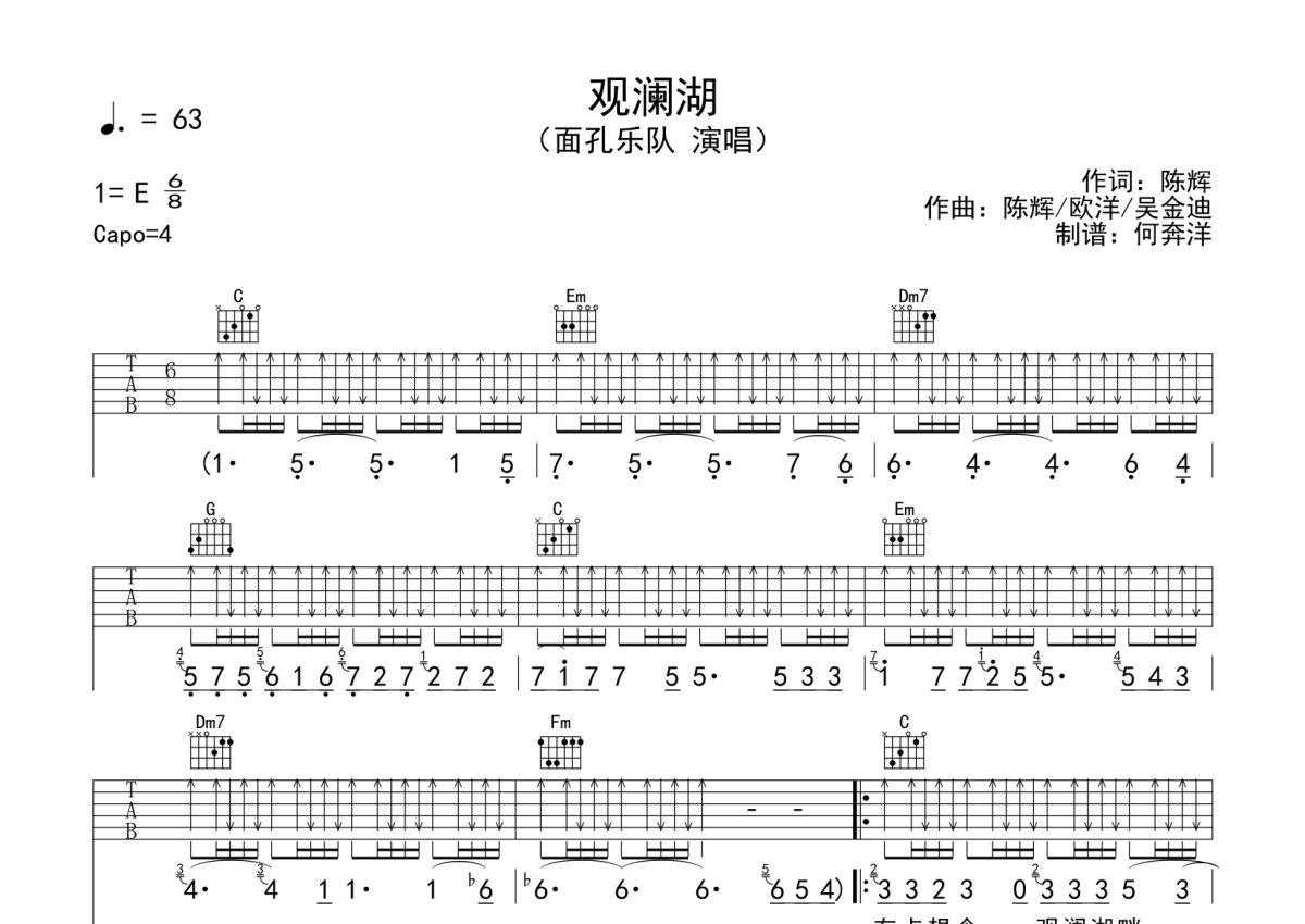 面孔乐队《观澜湖》吉他谱 - C调弹唱六线谱