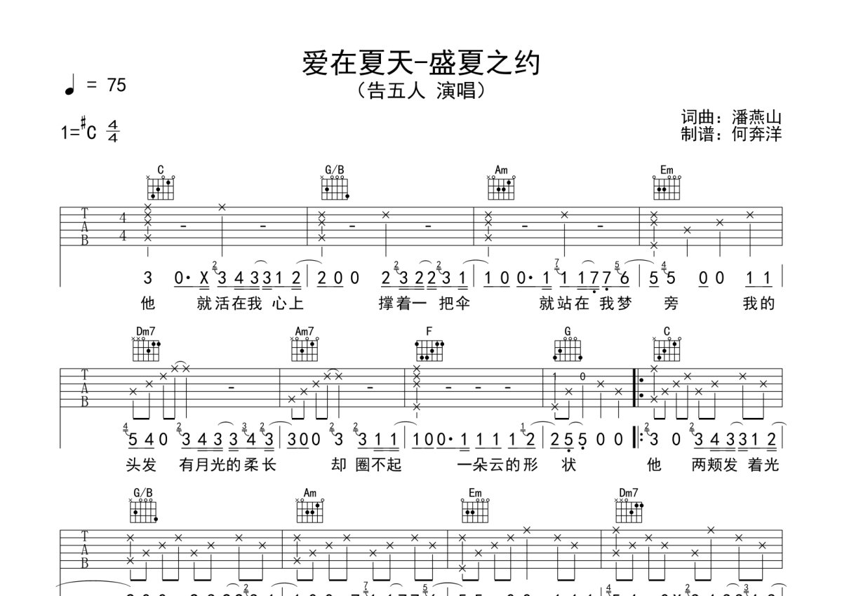 告五人《爱在夏天-盛夏之约》吉他谱 - C调弹唱六线谱