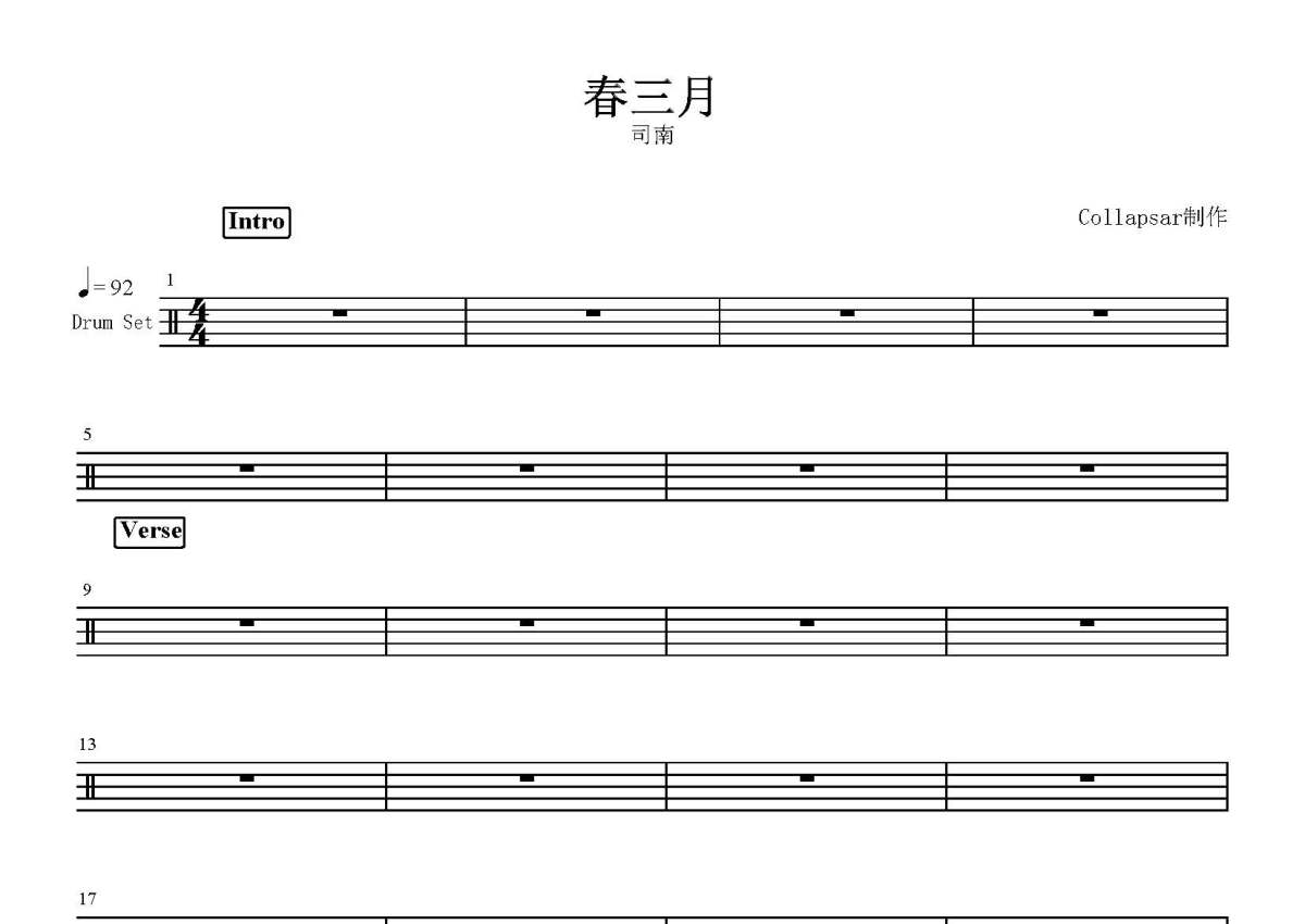 《春三月》是司南演唱的一首歌曲,这份鼓谱共有两张高清图谱,图谱由 @打鼓谱 编配上传,图谱使用五线谱编配,使用这份春三月架子鼓谱,你将能够轻松地敲打出这首司南的春三月,快来尝试吧。《春三月》是由十二兄作词,米茶作曲,司南演唱的歌曲,收录于同名专辑《春三月》,发行于2020年3月1日。