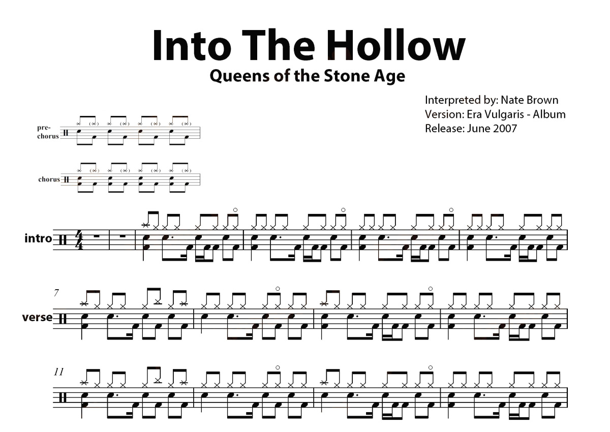 《Into The Hollow》是Queens Of The Stone Age演唱的一首歌曲,这份鼓谱共有三张高清图谱,图谱由 @打鼓谱 编配上传,图谱使用五线谱编配,使用这份Into The Hollow架子鼓谱,你将能够轻松地敲打出这首Queens Of The Stone Age的Into The Hollow,快来尝试吧。《Into The Hollow》现场版。 “石器时代皇后”(Queens Of The Stone Age)是近年来现场演出反响最好的乐队之一。这样说不仅是因为他们能够吸引戴夫·格罗Dave Grohl,原Nirvana乐队鼓手,现“喷火战机”(Foo Fighters)乐队主唱兼吉他手在内的众多大牌乐手的加盟,更多的是由于乐队成员娴熟的技巧和多元化的演绎方式。
