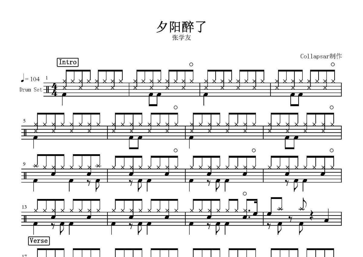 《夕阳醉了》是张学友演唱的一首歌曲,这份鼓谱共有四张高清图谱,图谱由 @打鼓谱 编配上传,图谱使用五线谱编配,使用这份夕阳醉了架子鼓谱,你将能够轻松地敲打出这首张学友的夕阳醉了,快来尝试吧。《夕阳醉了》是由童安格作曲、小美作词,张学友演唱的粤语歌曲,该曲收录于1989年12月1日发行的专辑《只愿一生爱一人》中。