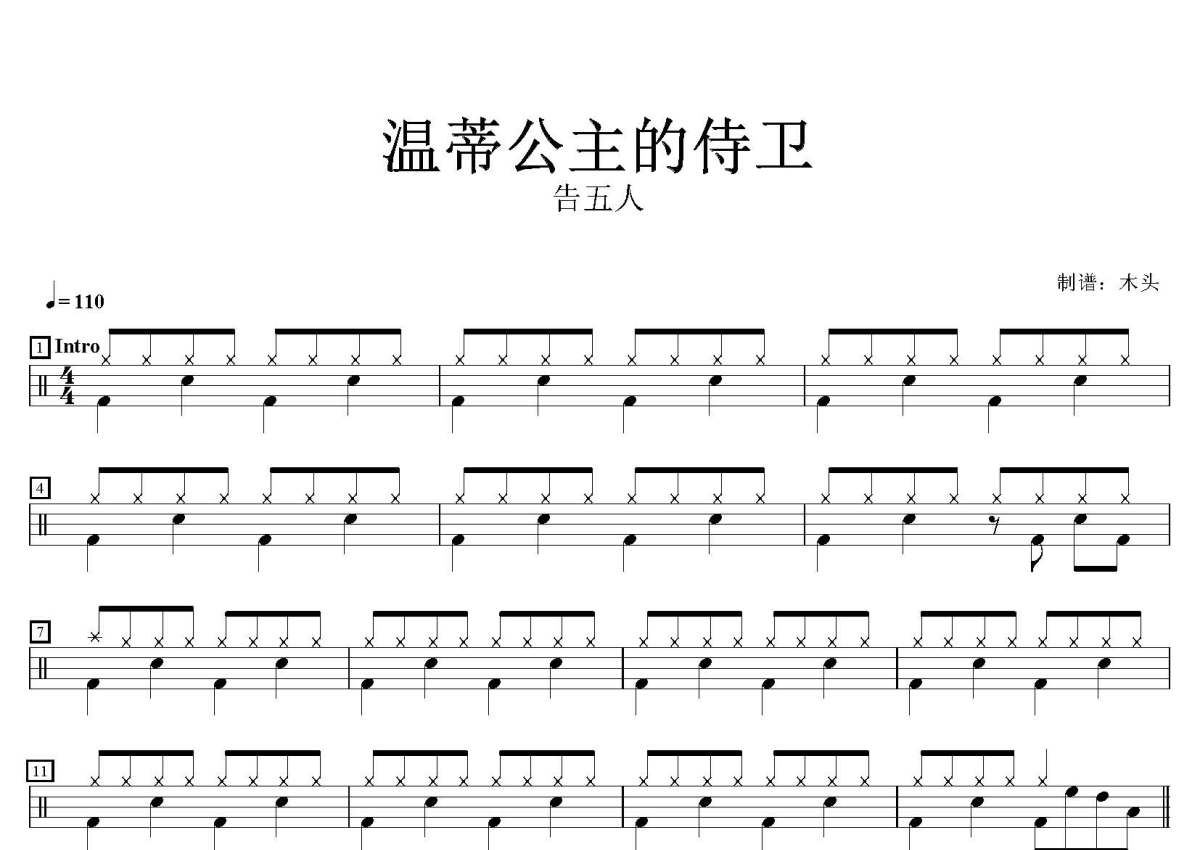 告五人《温蒂公主的侍卫》鼓谱 - 架子鼓谱