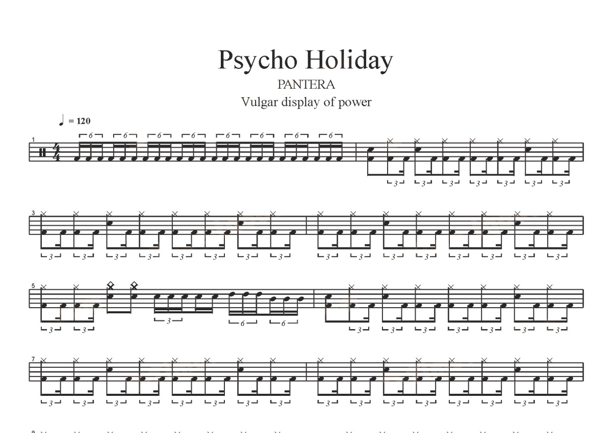 《Psycho Holiday》是潘多拉乐队/PANTERA演唱的一首歌曲,这份鼓谱共有五张高清图谱,图谱由 @打鼓谱 编配上传,图谱使用五线谱编配,使用这份Psycho Holiday架子鼓谱,你将能够轻松地敲打出这首潘多拉乐队/PANTERA的Psycho Holiday,快来尝试吧。《Psycho Holiday》现场版。潘多拉乐队(PANTERA),美国乐队,由吉他手Dimebag Darrell,鼓手Vinnie Paul,贝斯手Rex Brown和主唱Terrence Lee组成。