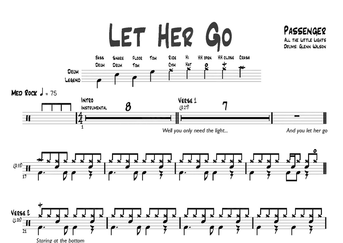 《Let Her Go》是Passenger演唱的一首歌曲,这份鼓谱共有两张高清图谱,图谱由 @打鼓谱 编配上传,图谱使用五线谱编配,使用这份Let Her Go架子鼓谱,你将能够轻松地敲打出这首Passenger的Let Her Go,快来尝试吧。《Let Her Go》是英国民谣创作歌手Passenger(Mike Rosenberg)第三张专辑《All The Little Lights》的第二支单曲,发行于2012年7月24日。Passenger是一支以英伦风为主,夹杂电子和民谣的多风格乐队,代表作品为《let her go》、《wicked man's rest》《holes》,主要成就是获得2013独立音乐奖、最佳民谣歌手称号。
