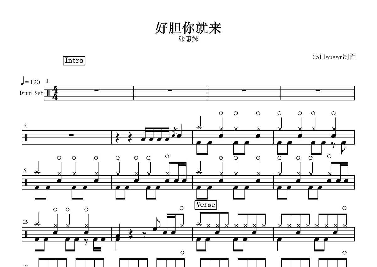 《好胆你就来》是张惠妹演唱的一首歌曲,这份鼓谱共有三张高清图谱,图谱由 @打鼓谱 编配上传,图谱使用五线谱编配,使用这份好胆你就来架子鼓谱,你将能够轻松地敲打出这首张惠妹的好胆你就来,快来尝试吧。《好胆你就来》是一首台语摇滚歌曲,由阿弟仔作词作曲,Martin Tang编曲,华语女歌手张惠妹演唱。并收录在专辑《阿密特》里。