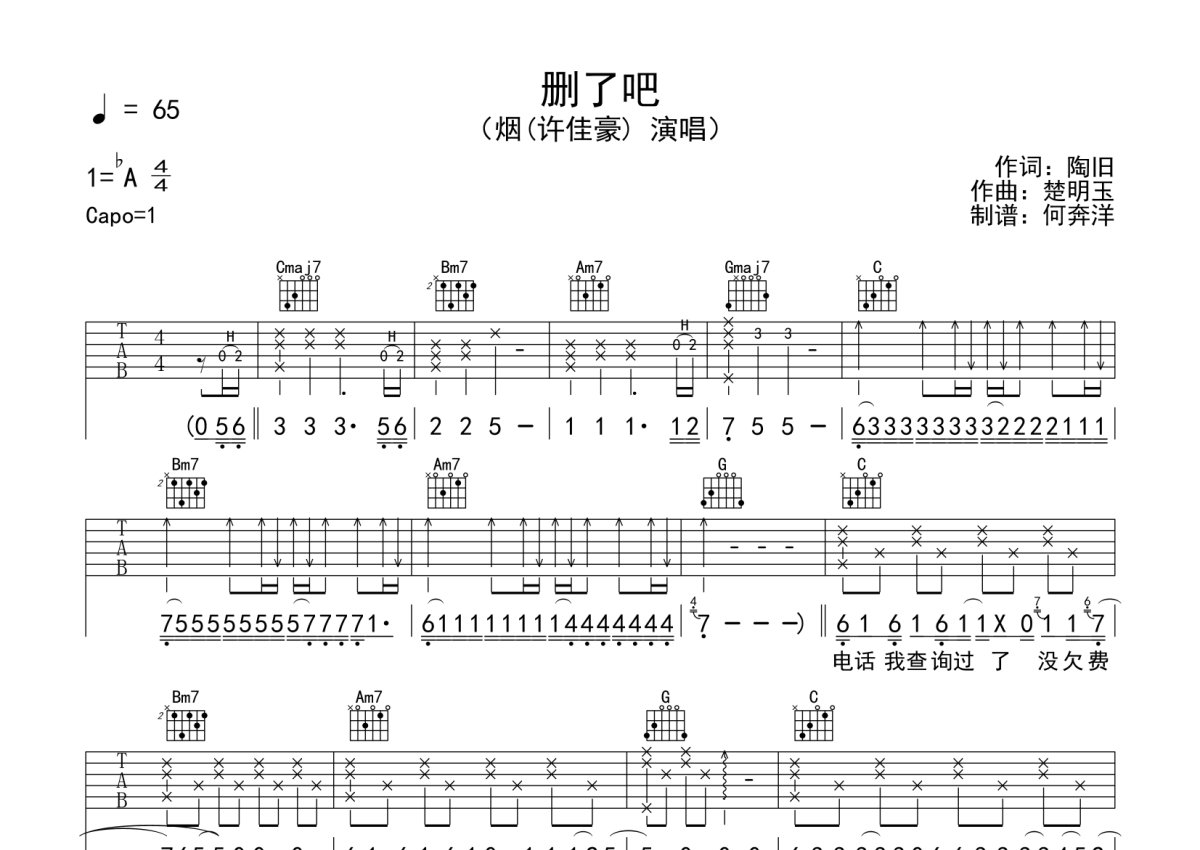 烟(许佳豪)《删了吧》吉他谱 - G调弹唱六线谱