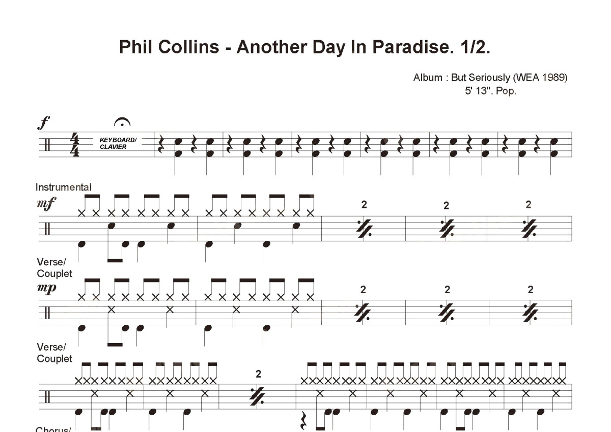 《Another Day in Paradise》是Phil Collins演唱的一首歌曲,这份鼓谱共有两张高清图谱,图谱由 @打鼓谱 编配上传,图谱使用五线谱编配,使用这份Another Day in Paradise架子鼓谱,你将能够轻松地敲打出这首Phil Collins的Another Day in Paradise,快来尝试吧。《Another Day in Paradise》是Phil Collins(菲尔·科林斯)最为出名的一首曲子,其翻唱版本多达数十种,歌曲象一首叙事诗,通过Phil Collins充满感情的歌声,表达了对弱者的同情和对“天堂”社会里的阴暗面的思考。菲尔·科林斯(Phil Collins),全名菲利普·大卫·查尔斯·科林斯(Philip David Charles Collins),1951年1月30日生于英格兰伦敦奇西克,英国歌手。