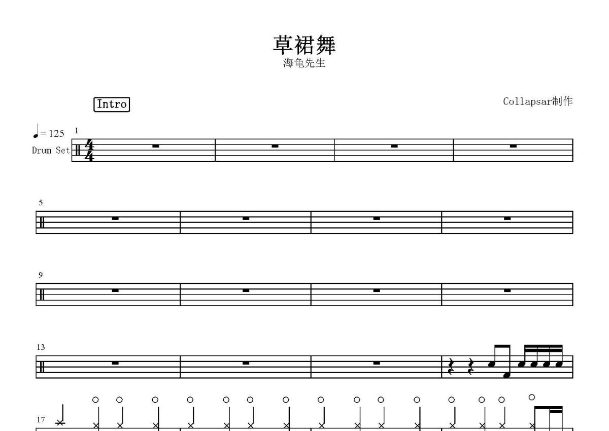 《草裙舞》是海龟先生演唱的一首歌曲,这份鼓谱共有四张高清图谱,图谱由 @打鼓谱 编配上传,图谱使用五线谱编配,使用这份草裙舞架子鼓谱,你将能够轻松地敲打出这首海龟先生的草裙舞,快来尝试吧。1。