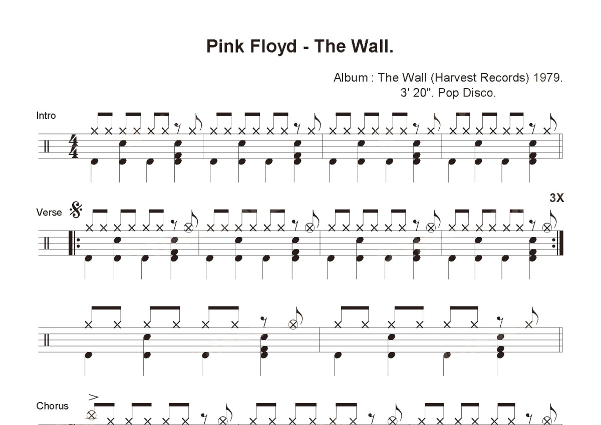 《Another Brick In The Wall》是Pink Floyd演唱的一首歌曲,这份鼓谱共有一张高清图谱,图谱由 @打鼓谱 编配上传,图谱使用五线谱编配,使用这份Another Brick In The Wall架子鼓谱,你将能够轻松地敲打出这首Pink Floyd的Another Brick In The Wall,快来尝试吧。《Another Brick In The Wall》是Pink Floyd演唱的歌曲,收录在1997年1月1日发行的专辑《Collection of Great Dance Song》中。平克·弗洛伊德(Pink Floyd),英国摇滚乐队,由贝斯手罗格·沃特斯、吉他手大卫·吉尔摩、鼓手尼克·马森、键盘手理查德·怀特以及吉他手西德·巴勒特组成。
