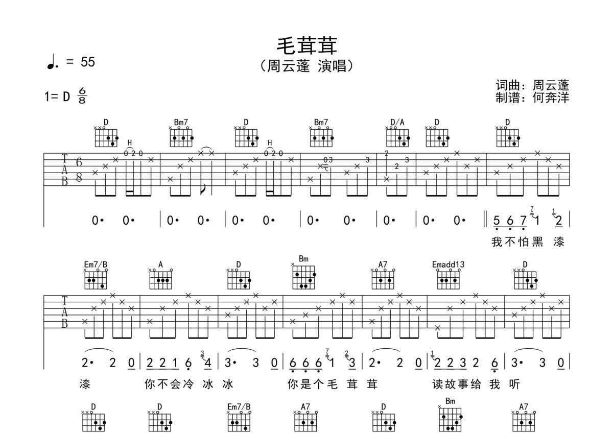 周云蓬《毛茸茸》吉他谱 - D调弹唱六线谱