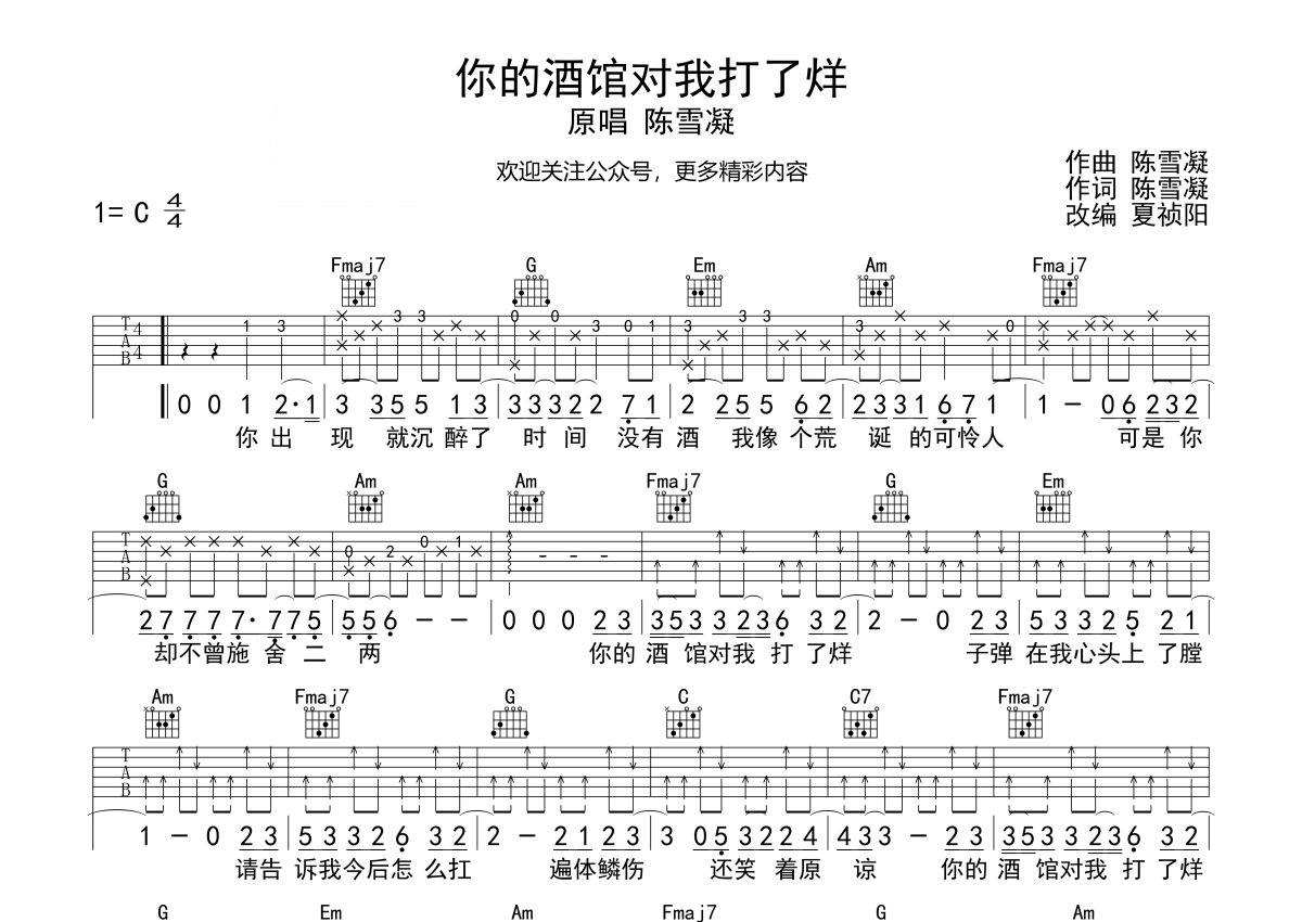 陈雪凝《你的酒馆对我打了烊》吉他谱 - C调弹唱六线谱