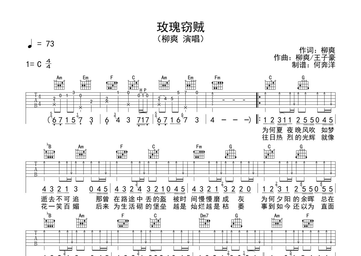 柳爽《玫瑰窃贼》吉他谱 - C调弹唱六线谱