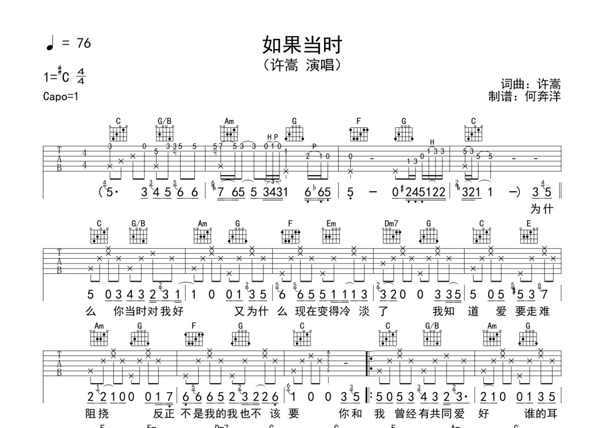 《如果当时》是许嵩演唱的一首歌曲,本吉他谱采用的是C调指法编配,这份吉他谱共有两张高清图谱,图谱由 @何奔洋 编配上传,图谱使用六线谱编配,包含吉他和弦指法、简谱以及歌词部分,曲谱配备了相关的音频提供试听,使用这份如果当时吉他谱,可以让你更加方便地掌握这首歌曲的弹唱技巧,快来尝试吧。完整版,带间奏尾奏SOLO(简谱)。