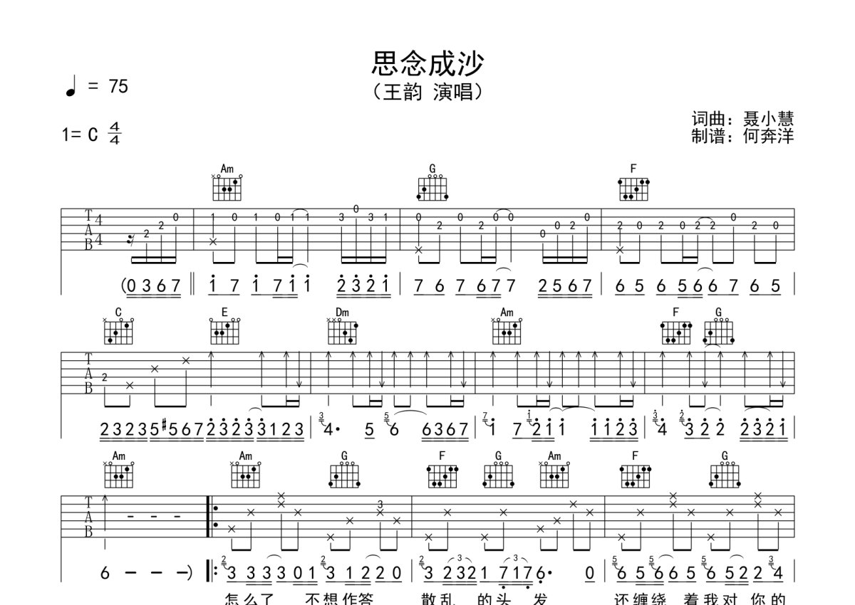 王韵《思念成沙》吉他谱 - C调弹唱六线谱