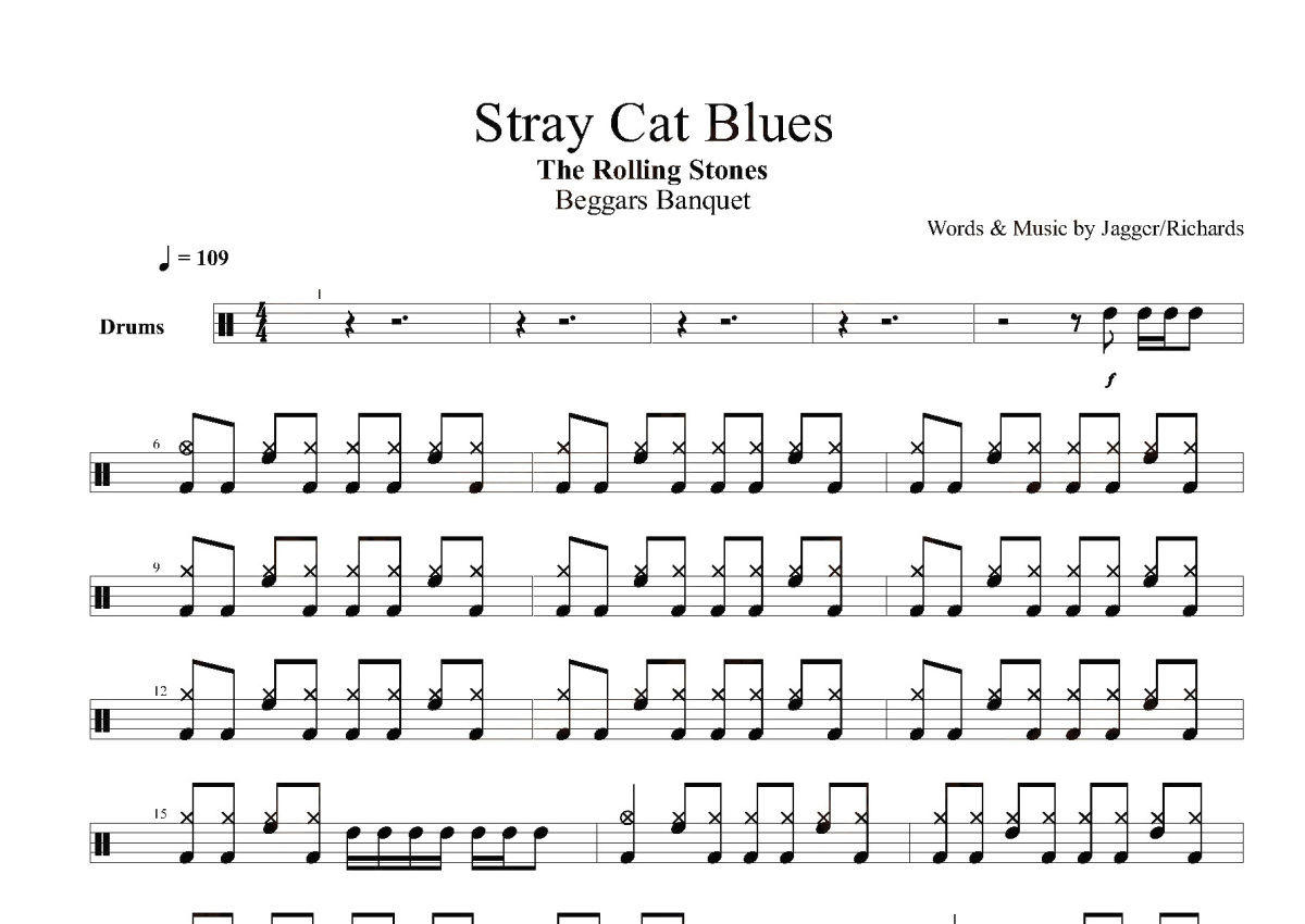 《Stray Cat Blues》是Rolling Stones演唱的一首歌曲,这份鼓谱共有三张高清图谱,图谱由 @打鼓谱 编配上传,图谱使用五线谱编配,使用这份Stray Cat Blues架子鼓谱,你将能够轻松地敲打出这首Rolling Stones的Stray Cat Blues,快来尝试吧。《Stray Cat Blues》现场版。滚石乐队(The Rolling Stones)是一支来自英国的摇滚乐队,成立于1962年,自成立以来一直延续着传统蓝调摇滚的路线。截至2014年,乐队的四位成员分别是米克·贾格尔、查理·沃茨、朗尼·伍德和基思·理查兹。