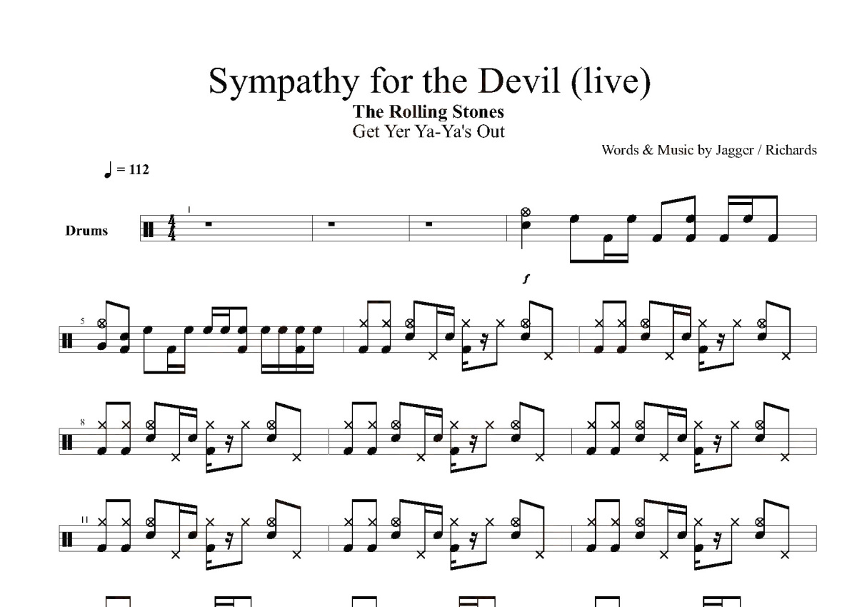 《Sympathy for the Devil》是Rolling Stones演唱的一首歌曲,live,这份鼓谱共有五张高清图谱,图谱由 @打鼓谱 编配上传,图谱使用五线谱编配,使用这份Sympathy for the Devil架子鼓谱,你将能够轻松地敲打出这首Rolling Stones的Sympathy for the Devil,快来尝试吧。《Sympathy for the Devil》是the rolling stones演唱的歌曲,所属专辑是《Beggars Banquet》。这首歌用第一人称的叙事角度,以一种反讽的方式致敬魔鬼,控诉贯穿于整个人类历史的暴行。歌曲融合了桑巴元素。在滚石杂志评选的史上最伟大的500首歌曲中位列第32位。滚石乐队(The Rolling Stones)是一支来自英国的摇滚乐队,成立于1962年,自成立以来一直延续着传统蓝调摇滚的路线。截至2014年,乐队的四位成员分别是米克·贾格尔、查理·沃茨、朗尼·伍德和。