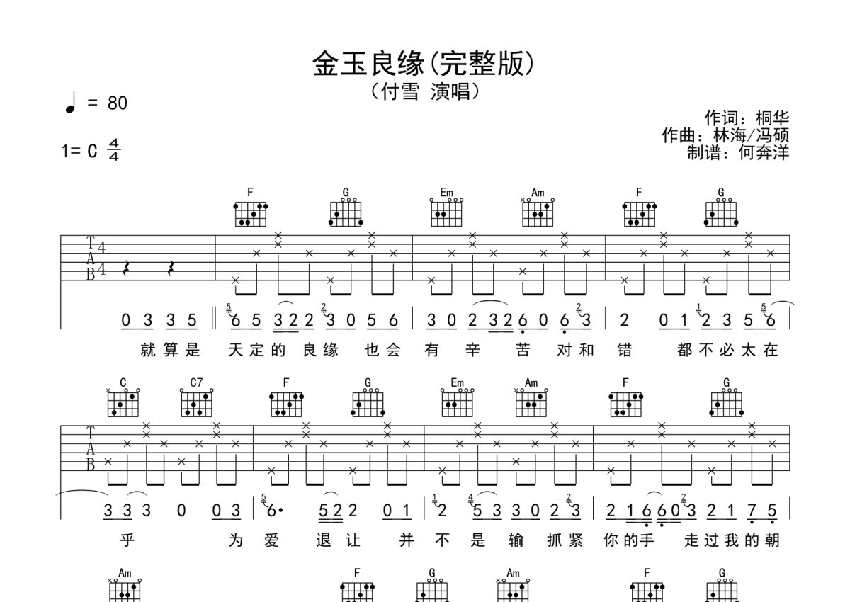 付雪《金玉良缘》吉他谱 - C调弹唱六线谱 - 完整版