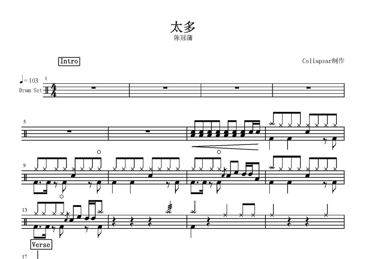 《太多》是陈冠蒲演唱的一首歌曲,这份鼓谱共有三张高清图谱,图谱由 @打鼓谱 编配上传,图谱使用五线谱编配,使用这份太多架子鼓谱,你将能够轻松地敲打出这首陈冠蒲的太多,快来尝试吧。歌曲《太多》,由陈冠蒲演唱,李岩修作词,徐嘉良作曲,收录在《就让你走》专辑中。