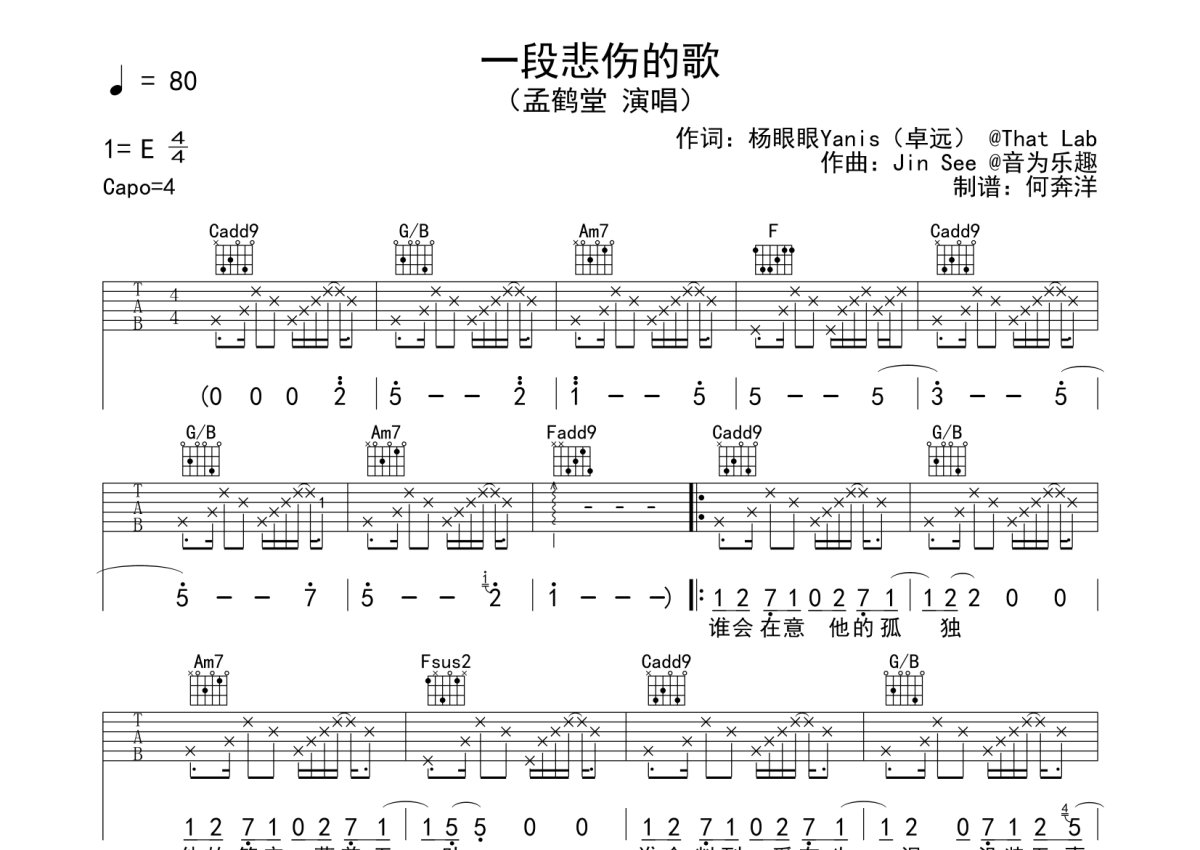 孟鹤堂《一段悲伤的歌》吉他谱 - C调弹唱六线谱