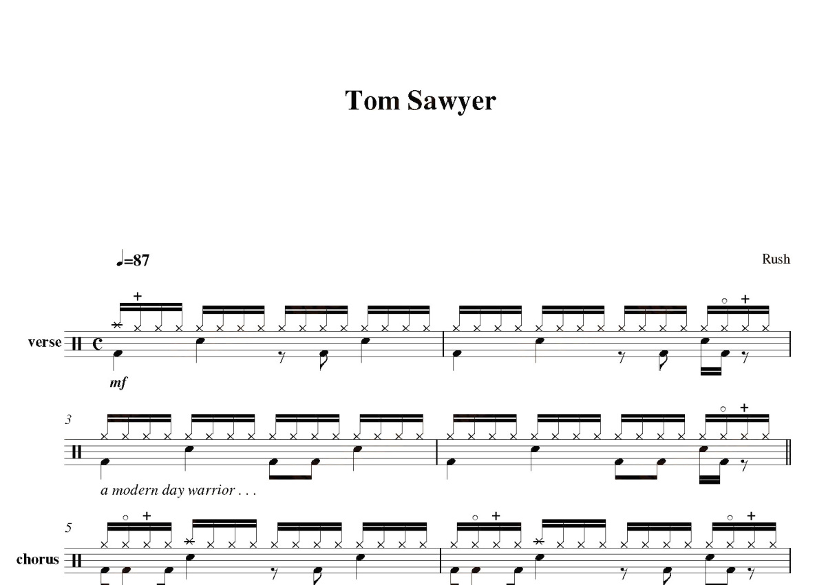 《tom sawyer》是Rush演唱的一首歌曲,这份鼓谱共有四张高清图谱,图谱由 @打鼓谱 编配上传,图谱使用五线谱编配,使用这份tom sawyer架子鼓谱,你将能够轻松地敲打出这首Rush的tom sawyer,快来尝试吧。《tom sawyer》现场版。