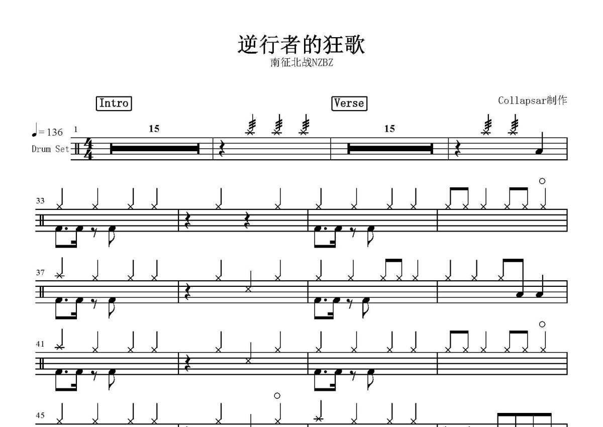 南征北战NZBZ《逆行者的狂歌》鼓谱 - 架子鼓谱